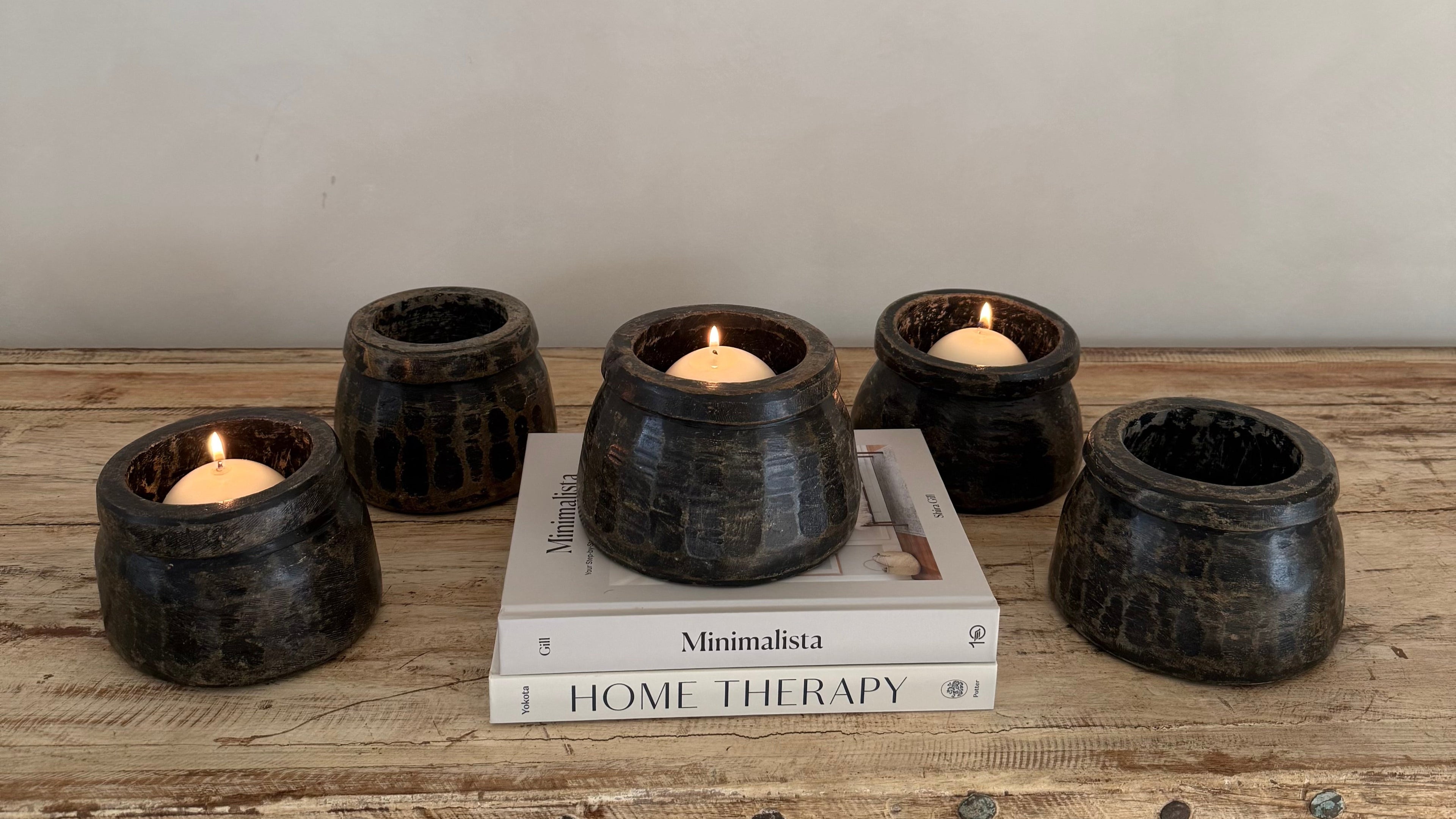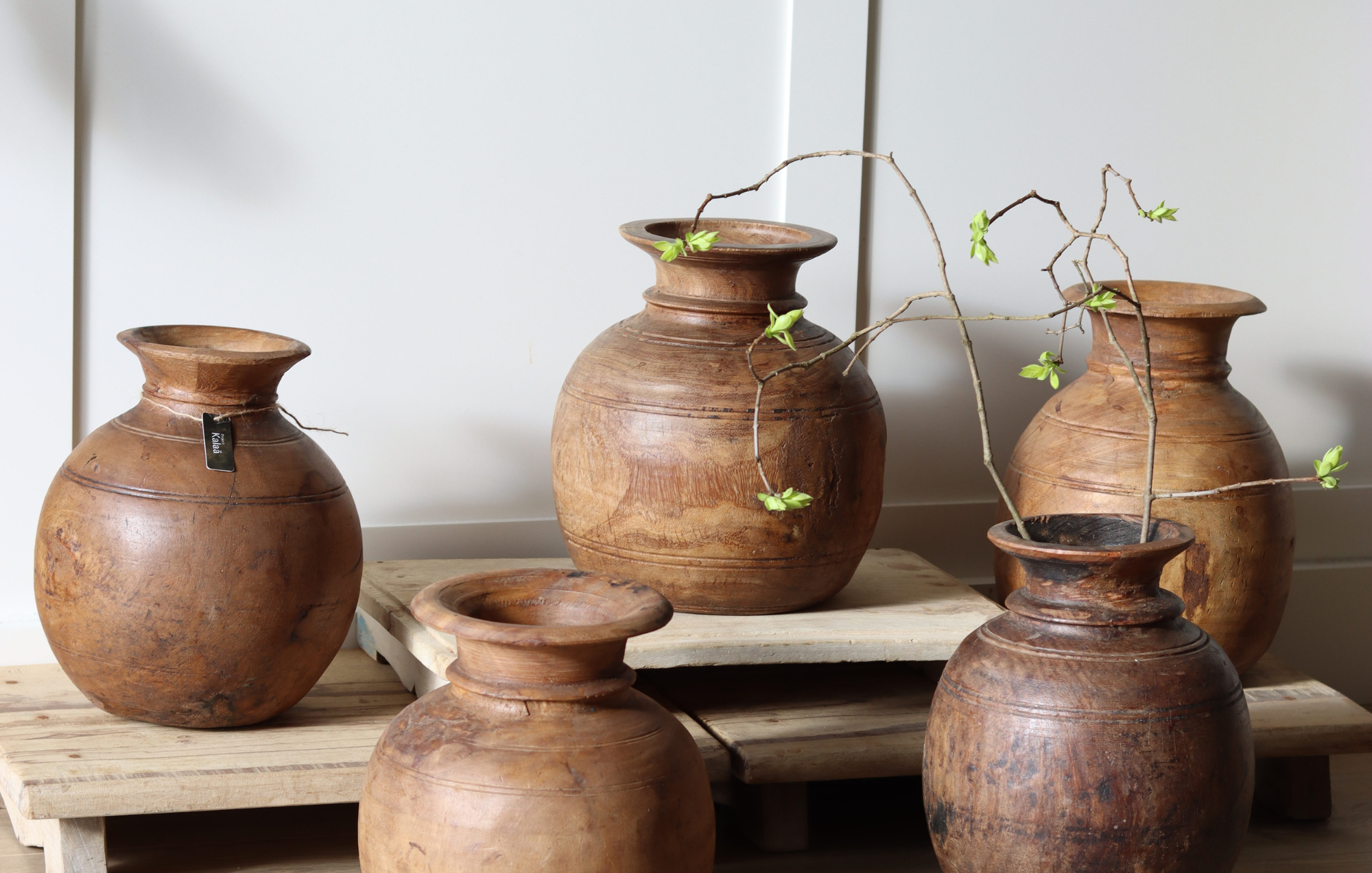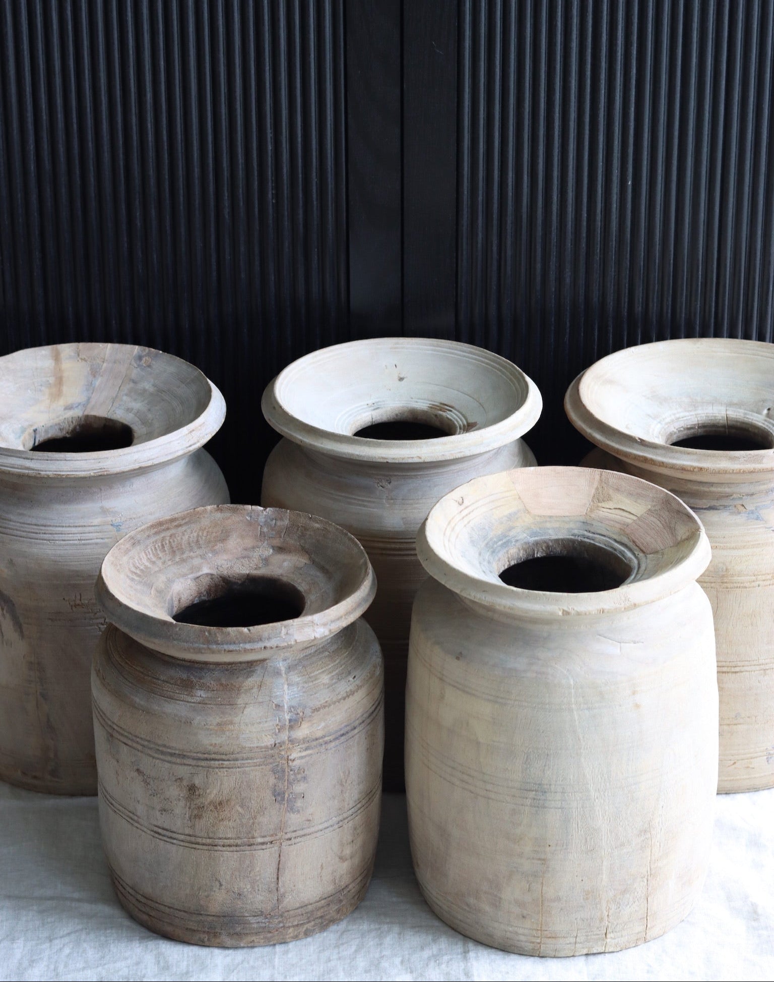 We find and curate lost objects of history which once breathe rich art and culture. Crafted from a single piece of wood, these Vintage Himachal pots were traditionally used to store grains in rural regions of India and Nepal. They have a unique vintage appearance. Their rounded shape, raw finish, and unique character make each one a standout piece. Perfect for showcasing dried foliage or as elegant empty displays, these pots boast natural grain, distinct markings, and charming imperfections.