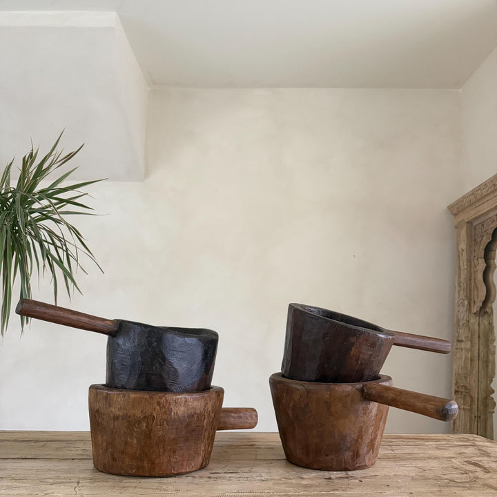 Bring rustic charm and authentic craftsmanship into your home with this Hand-Carved Wooden Vintage Mortar. Made from solid wood and shaped entirely by hand, this piece was originally used to grind grains, herbs, and spices. Its carved handle provided precision and control, giving it both beauty and purpose.