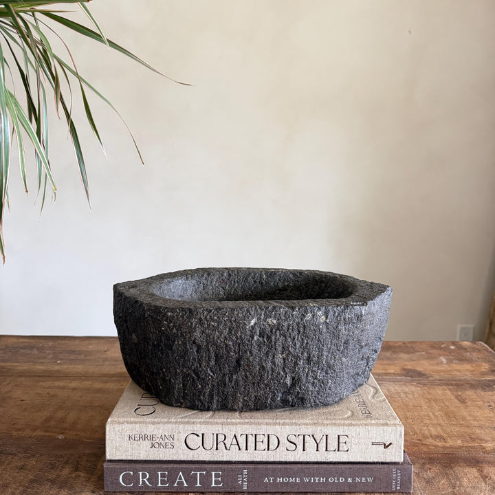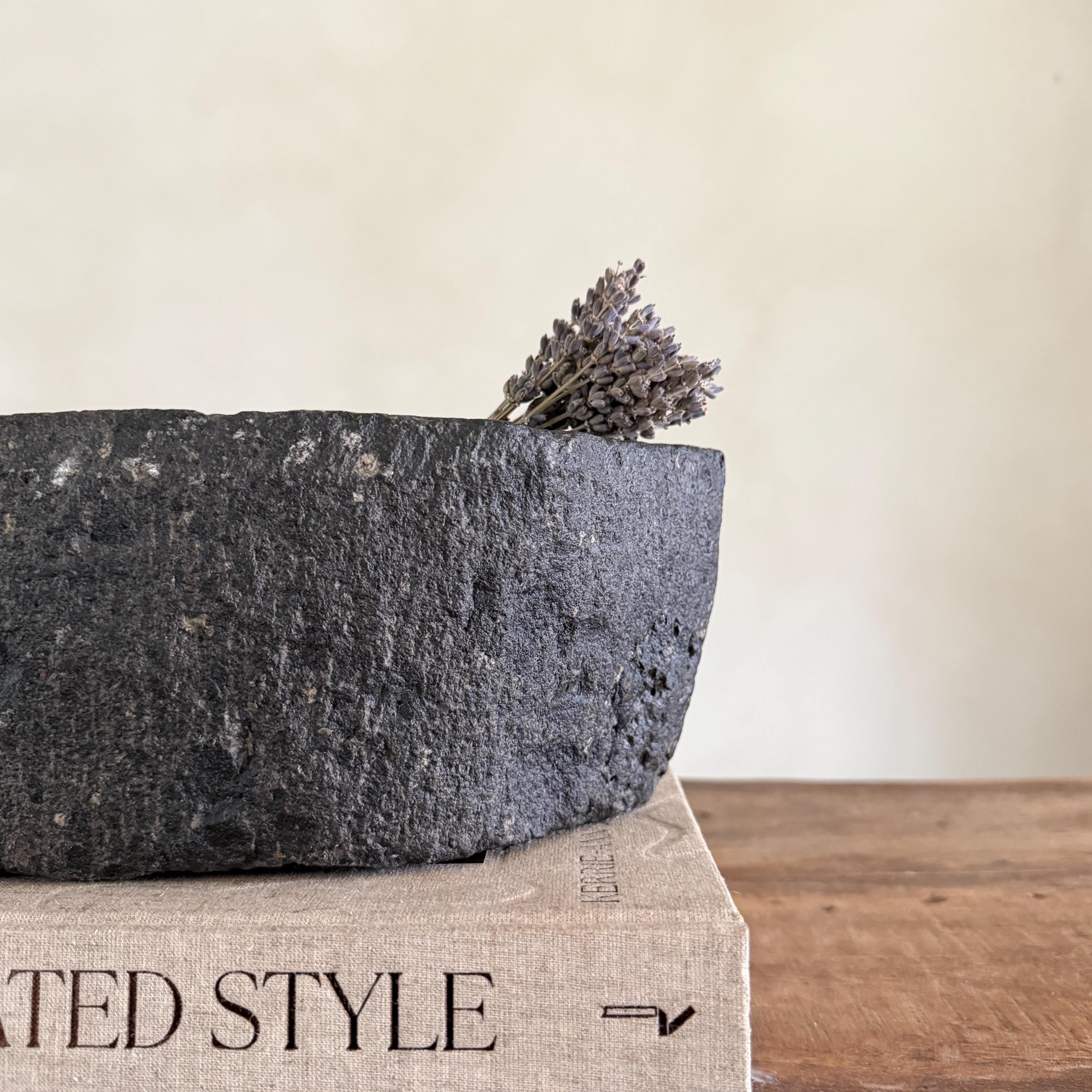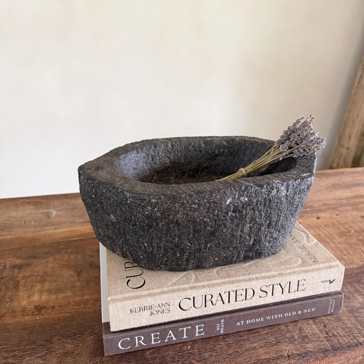 Each stone mortar is one-of-a-kind, featuring natural variations in stone texture, shape, and colour. Due to its handcrafted and vintage nature, expect slight irregularities, chisel marks, and imperfections.