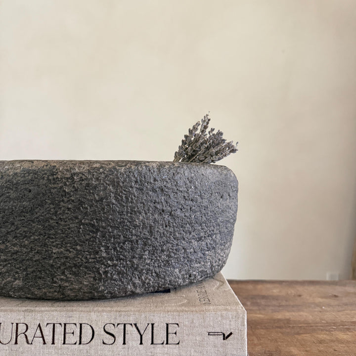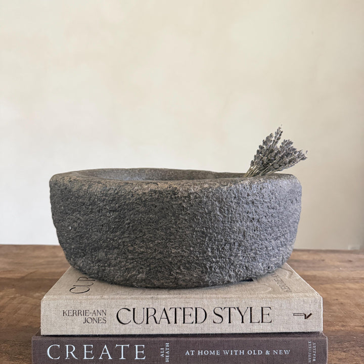 Each stone mortar is one-of-a-kind, featuring natural variations in stone texture, shape, and colour. Due to its handcrafted and vintage nature, expect slight irregularities, chisel marks, and imperfections.