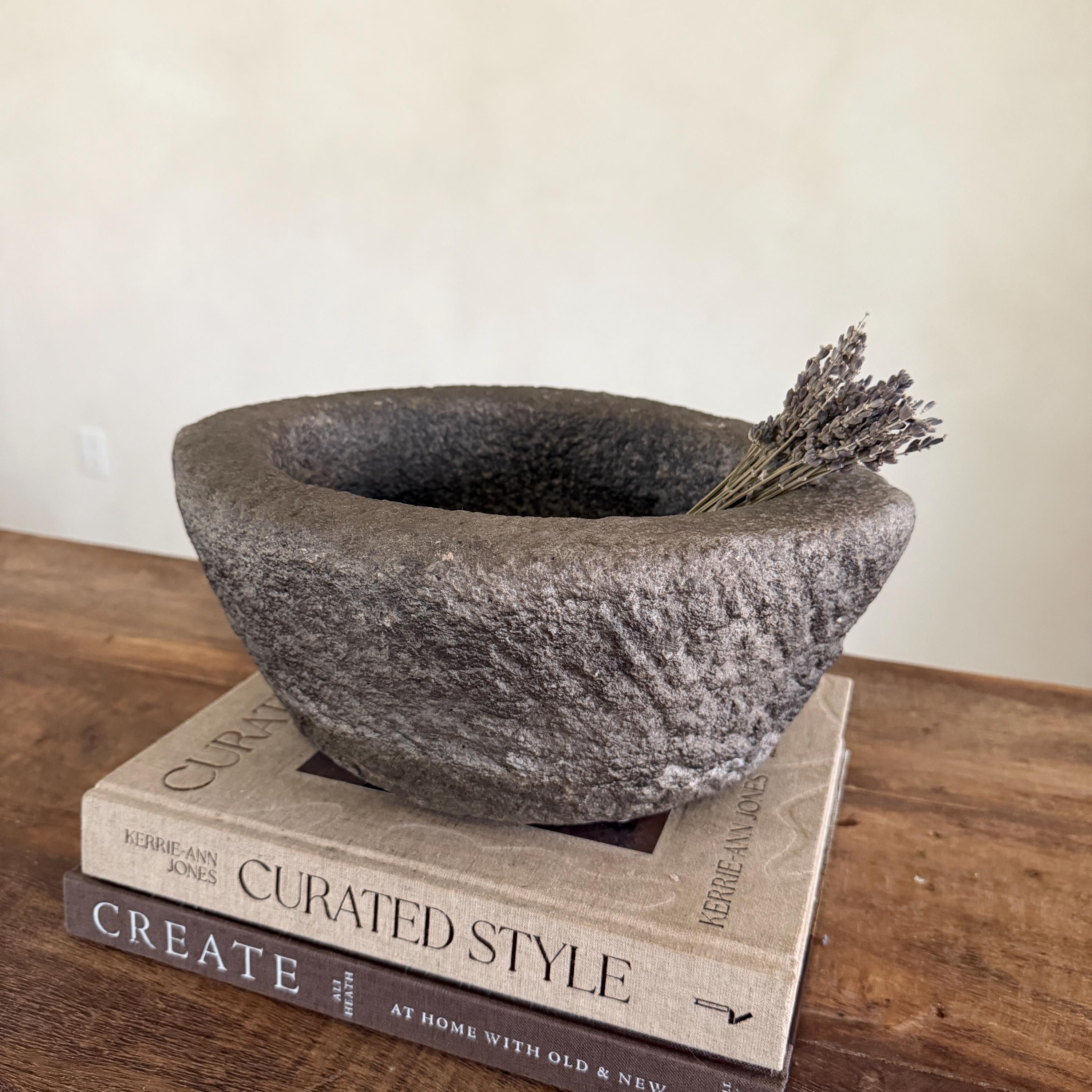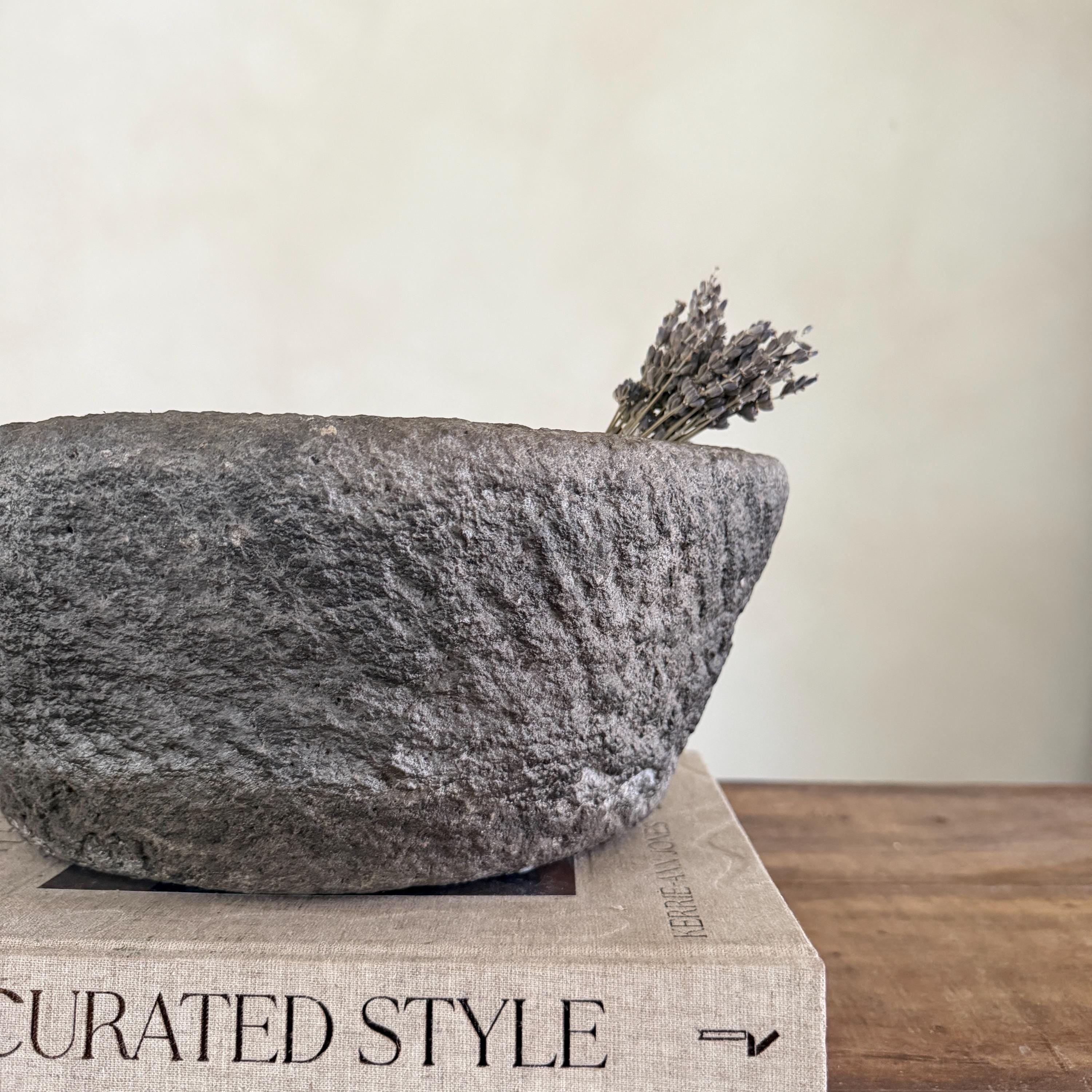 Each stone mortar is one-of-a-kind, featuring natural variations in stone texture, shape, and colour. Due to its handcrafted and vintage nature, expect slight irregularities, chisel marks, and imperfections.