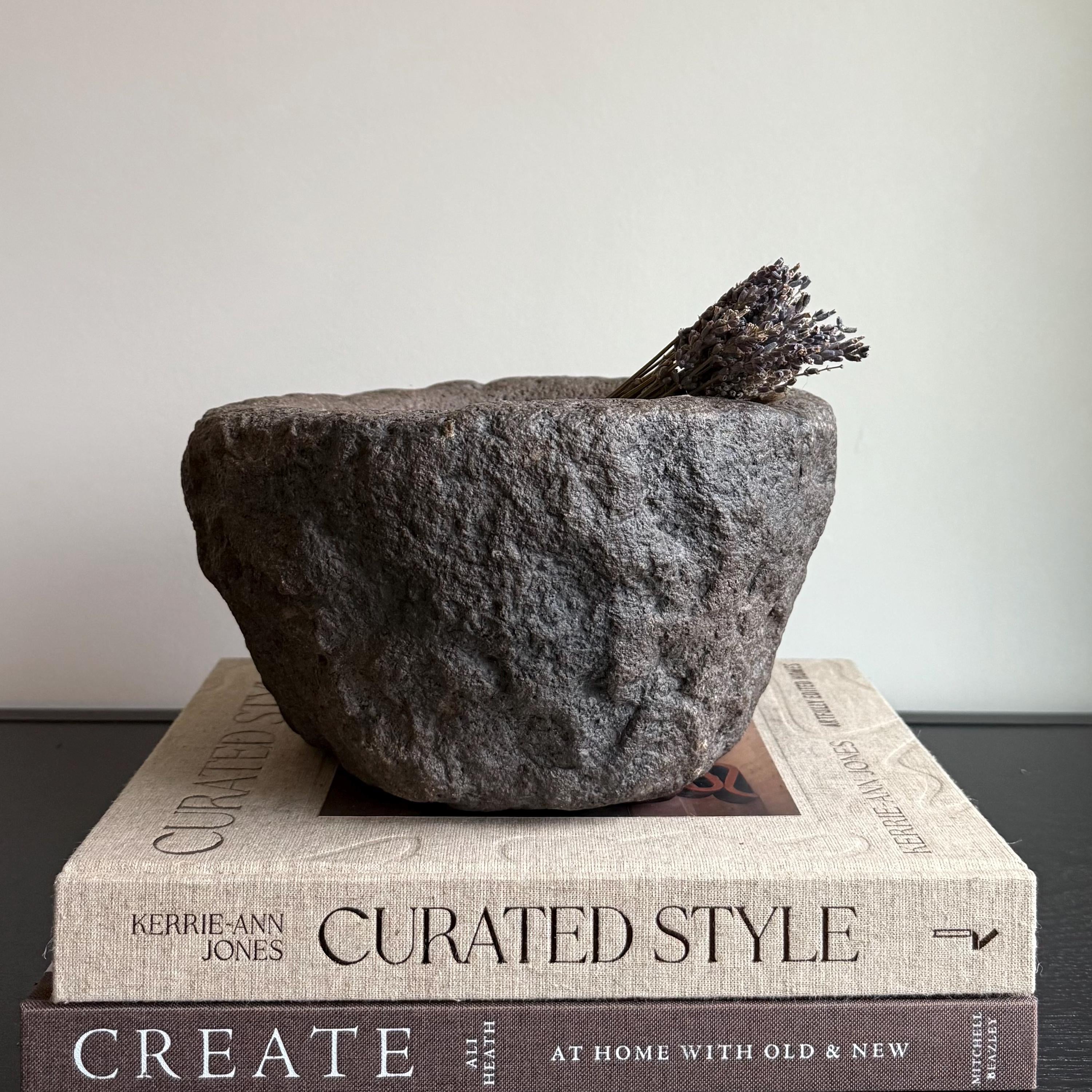 Each stone mortar is one-of-a-kind, featuring natural variations in stone texture, shape, and colour. Due to its handcrafted and vintage nature, expect slight irregularities, chisel marks, and imperfections.