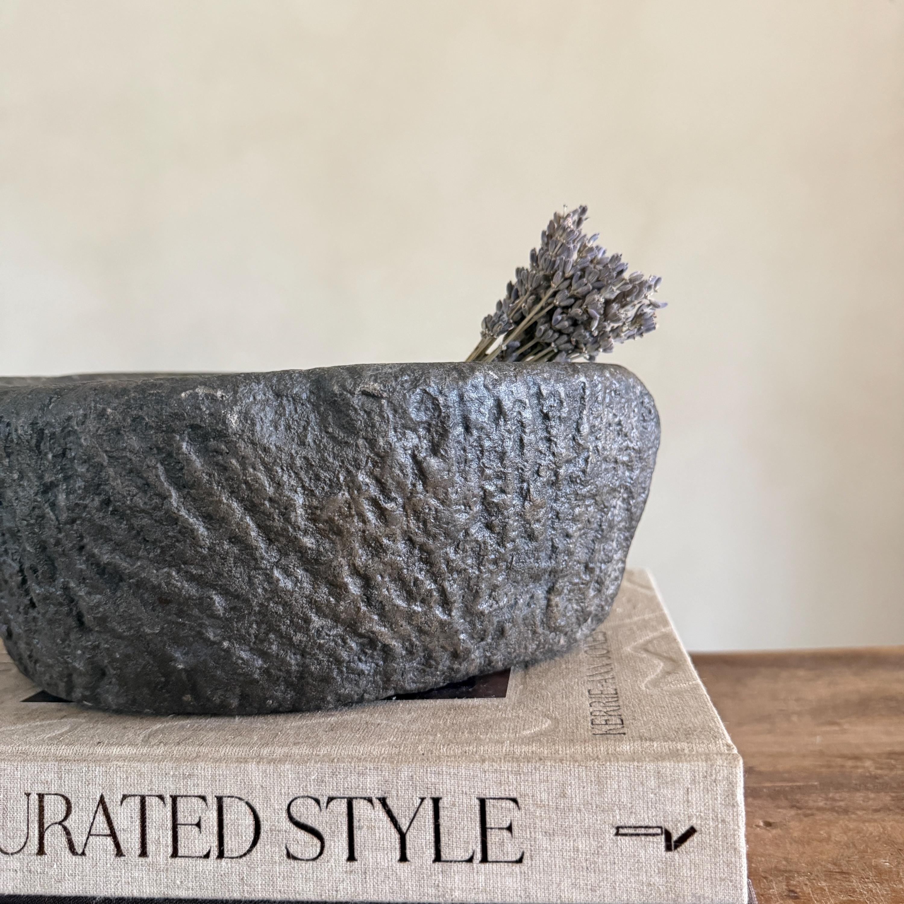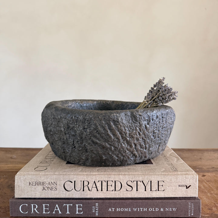 Each stone mortar is one-of-a-kind, featuring natural variations in stone texture, shape, and colour. Due to its handcrafted and vintage nature, expect slight irregularities, chisel marks, and imperfections.