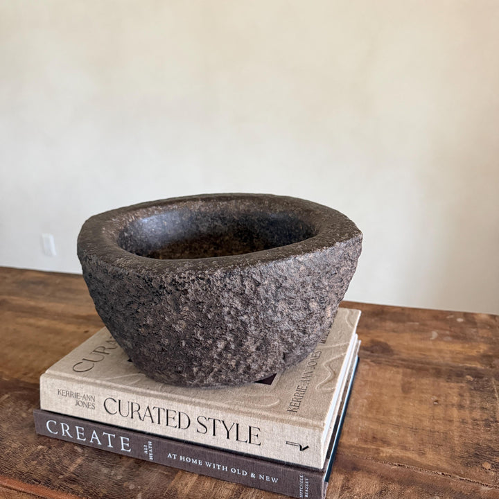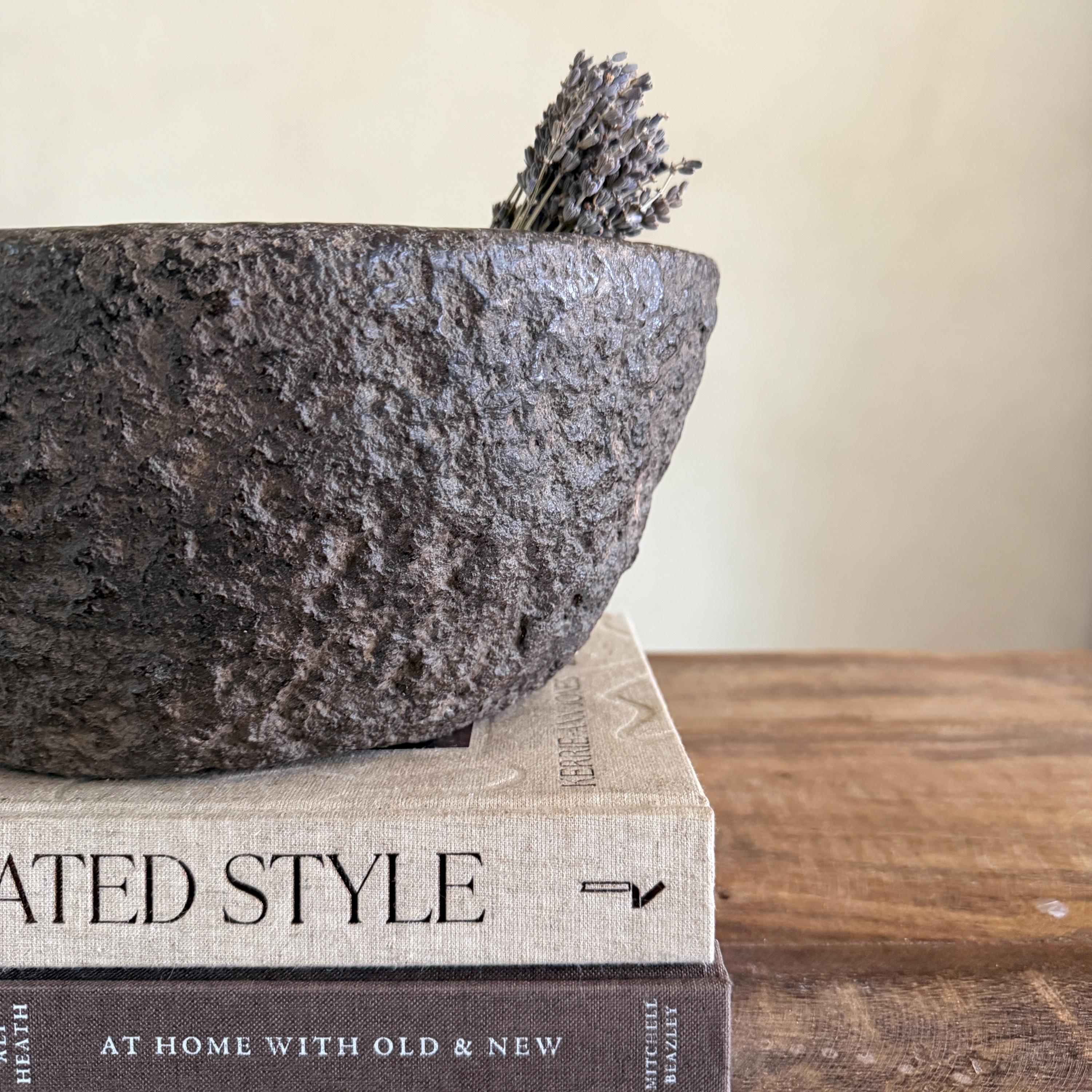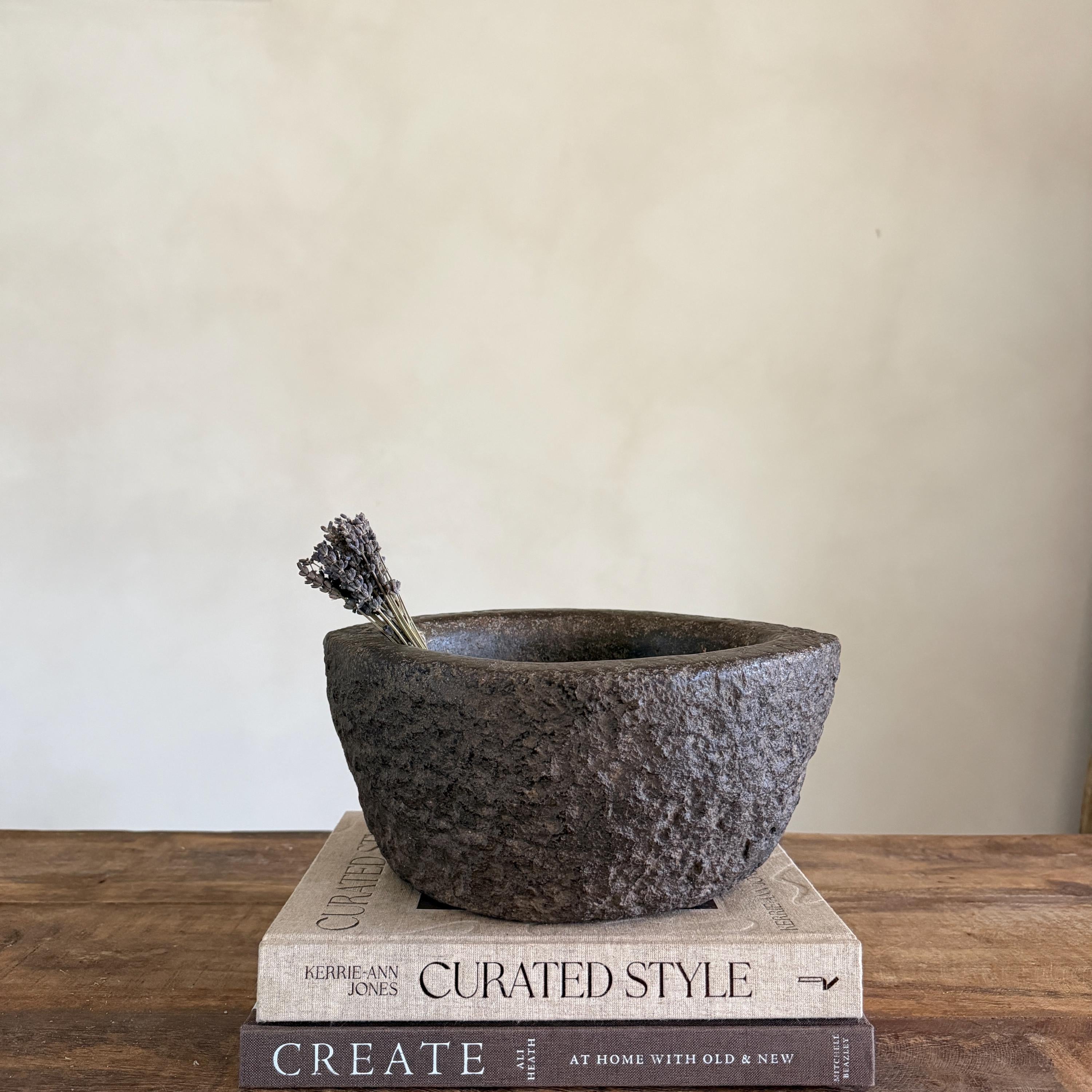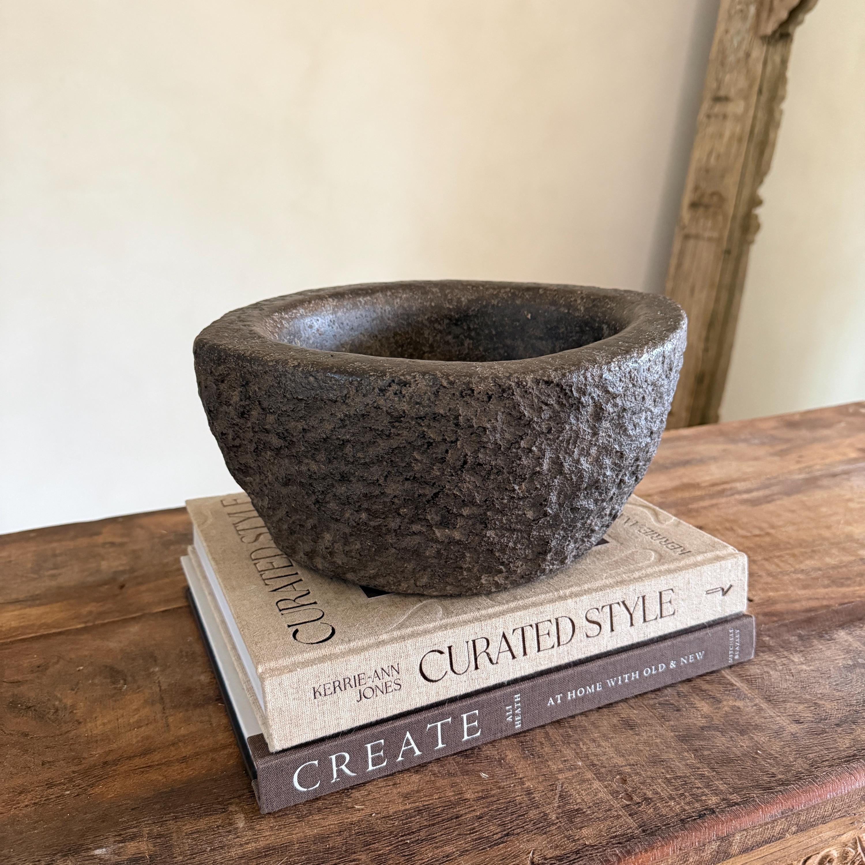 Each stone mortar is one-of-a-kind, featuring natural variations in stone texture, shape, and colour. Due to its handcrafted and vintage nature, expect slight irregularities, chisel marks, and imperfections.