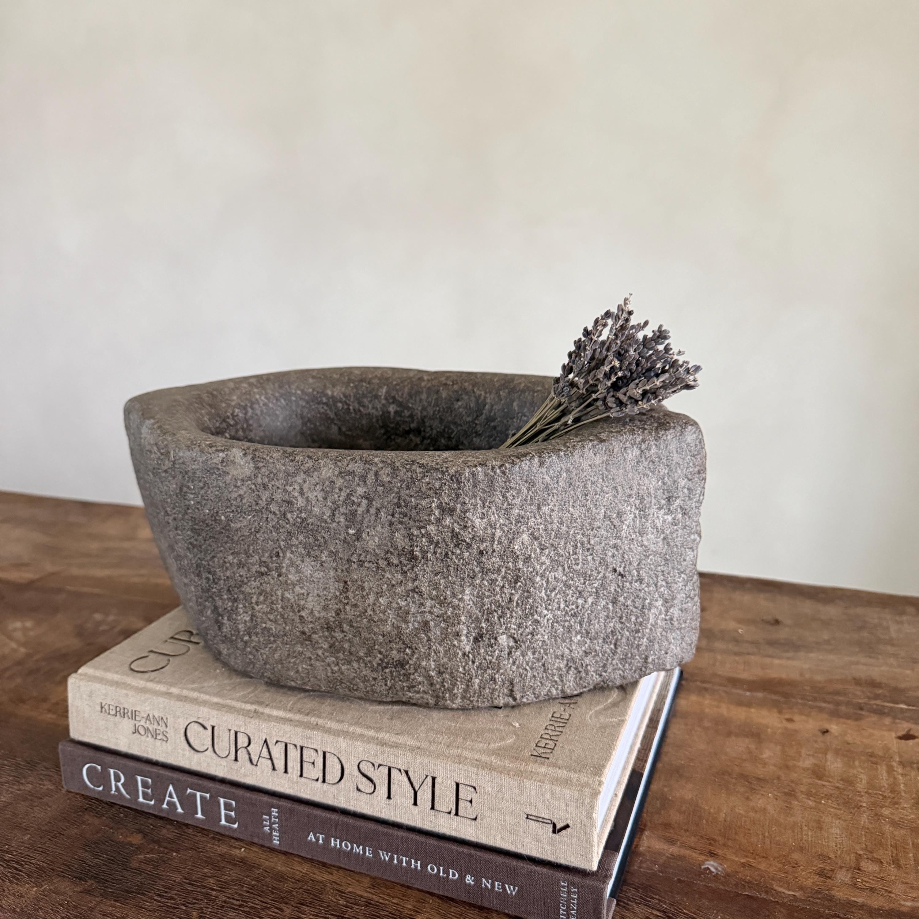 Each stone mortar is one-of-a-kind, featuring natural variations in stone texture, shape, and colour. Due to its handcrafted and vintage nature, expect slight irregularities, chisel marks, and imperfections.
