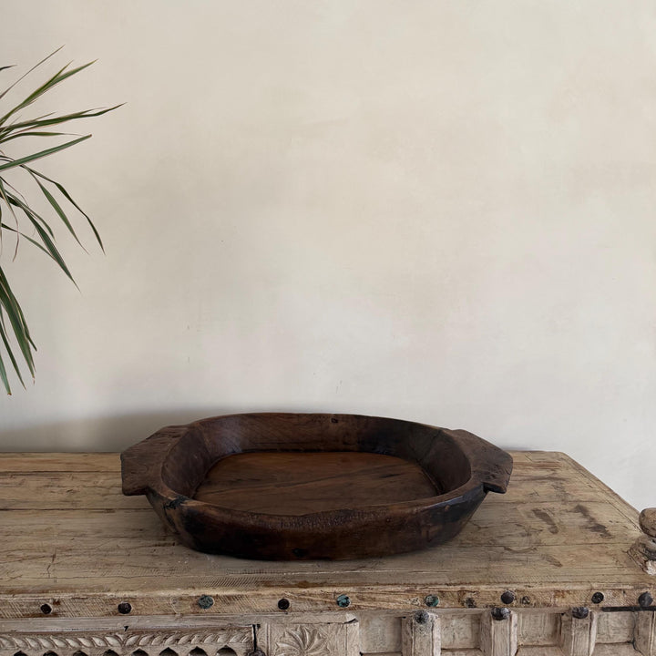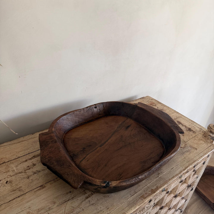 Handcrafted from solid teak wood in mid 1950s, traditionally this vintage parat tray was once used for kneading dough in Indian Kitchens. It embraces unique patina and character from years of use, making it perfect as a rustic Kitchen island centrepiece, console decor or coffee table timeless accent.