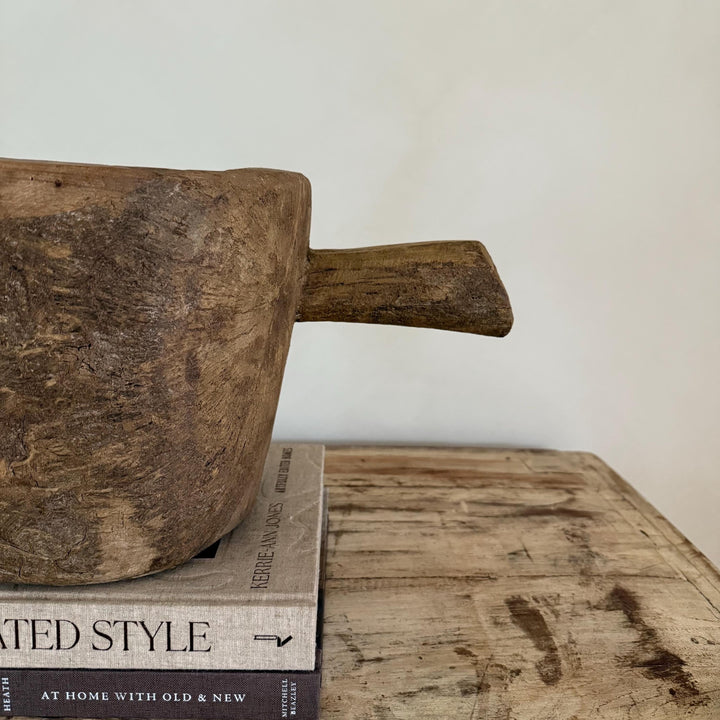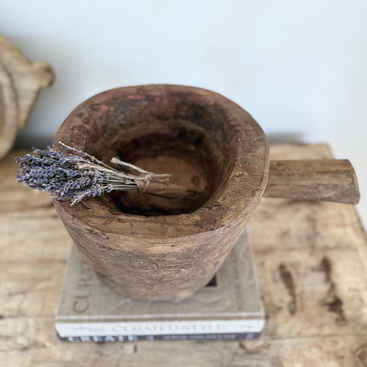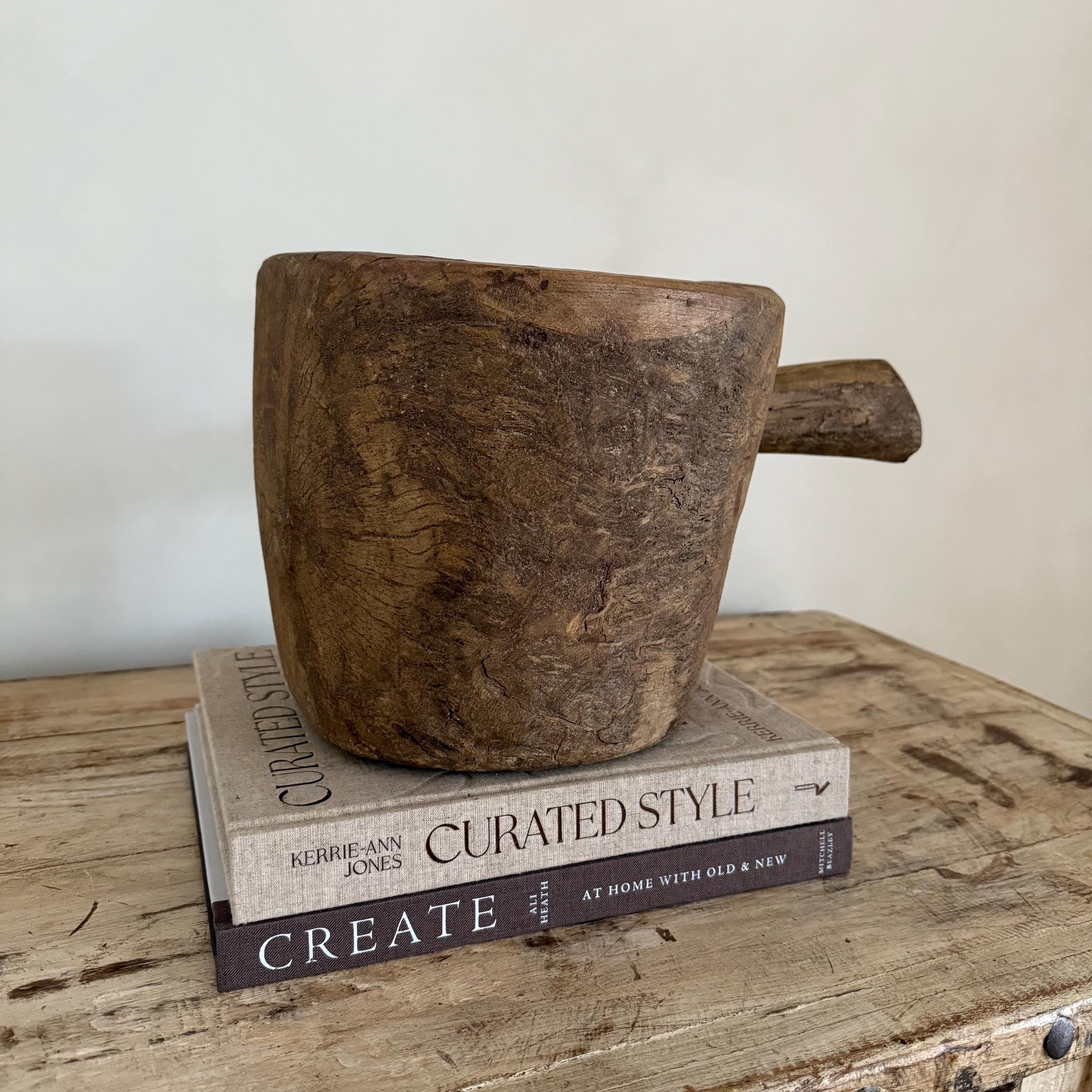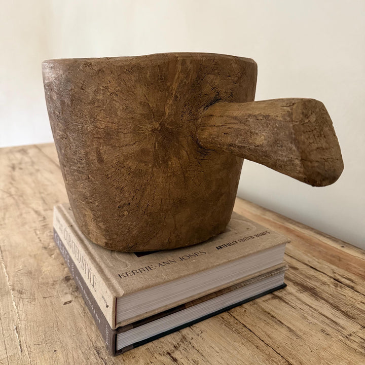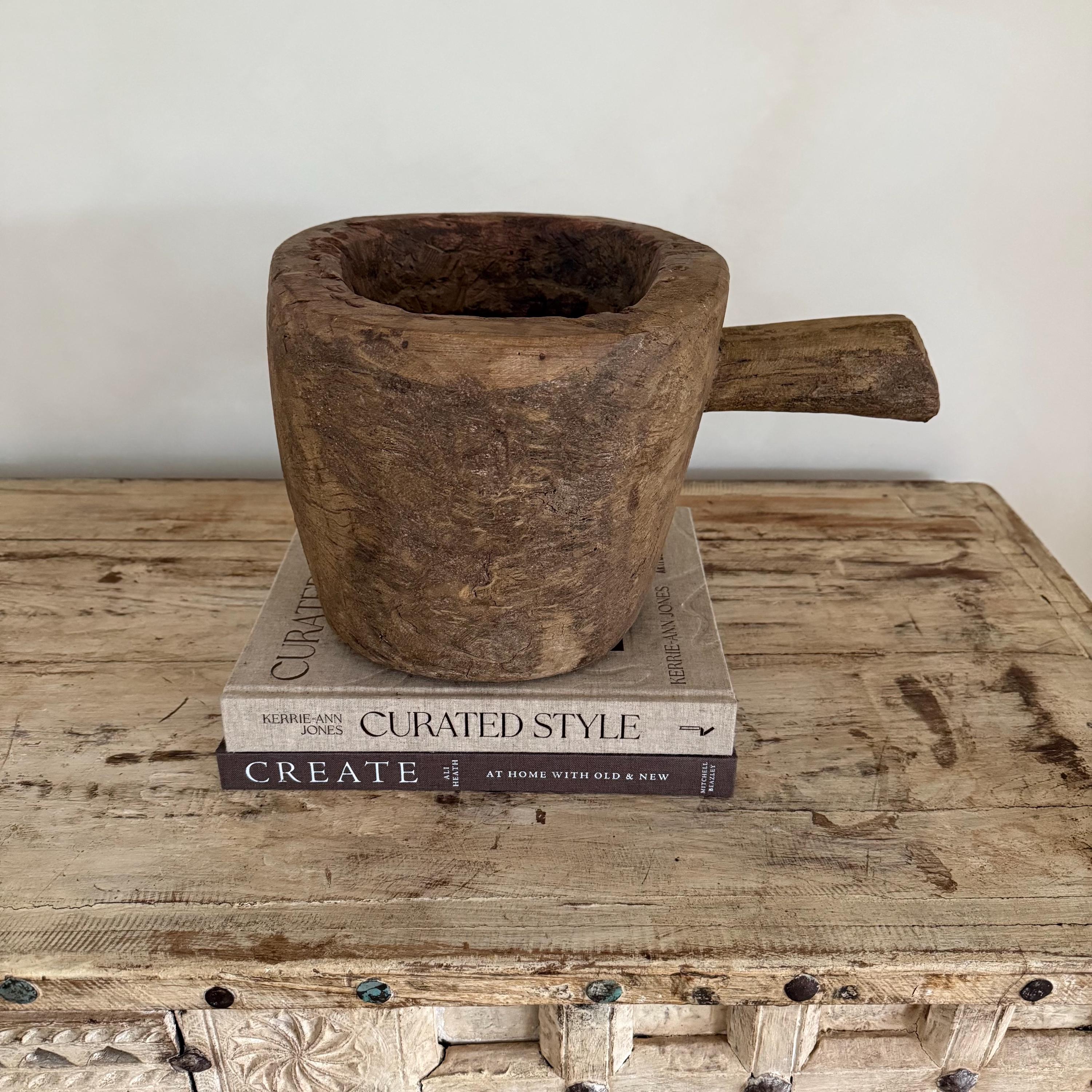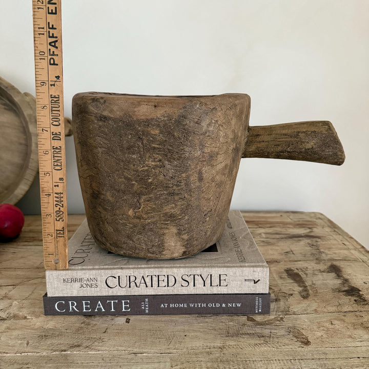 Antique Hand Carved Wooden Mortar | Vintage Rustic Grinder Bowl with Handle 12.5"