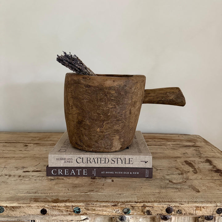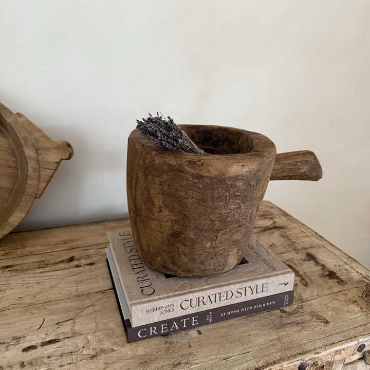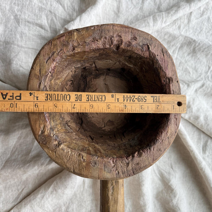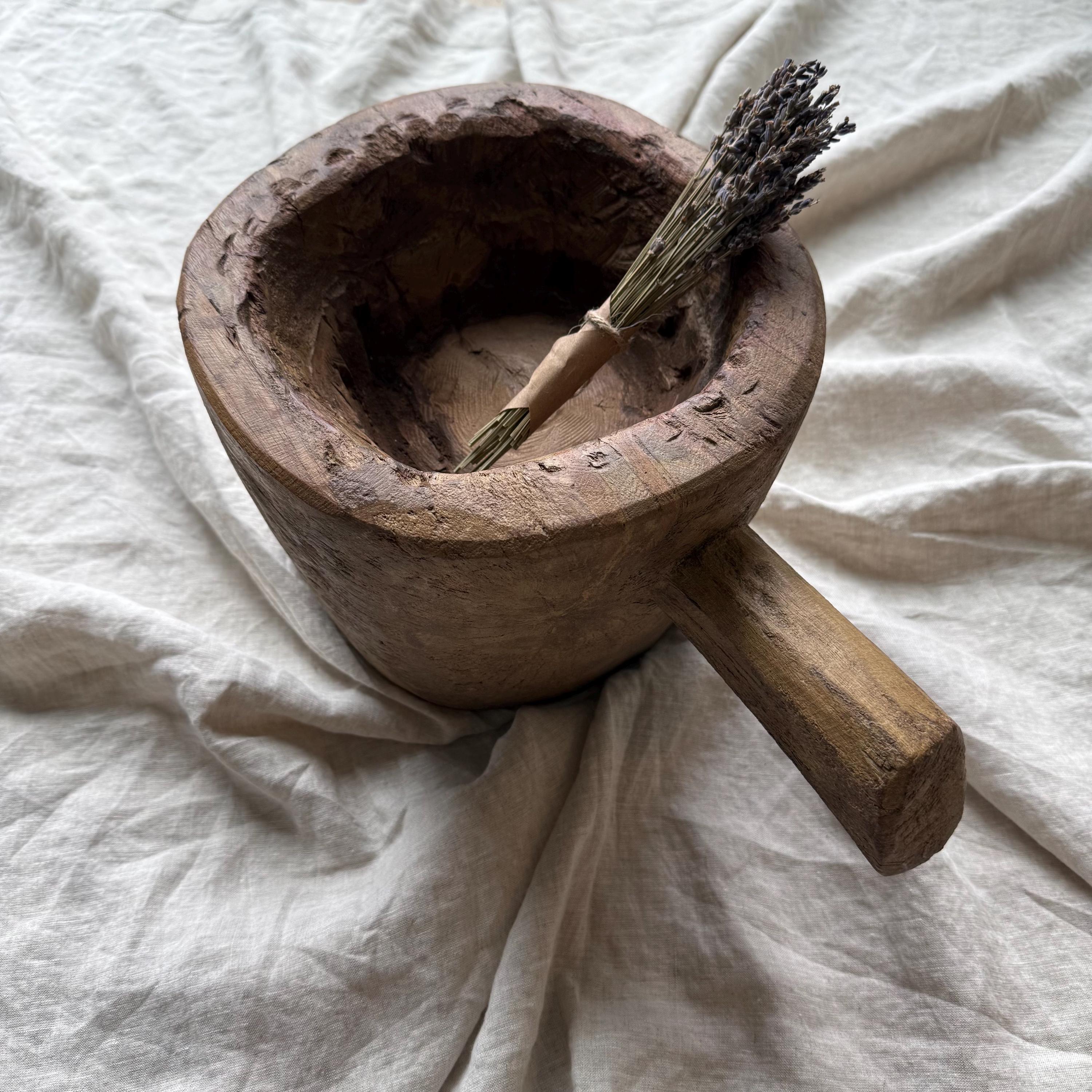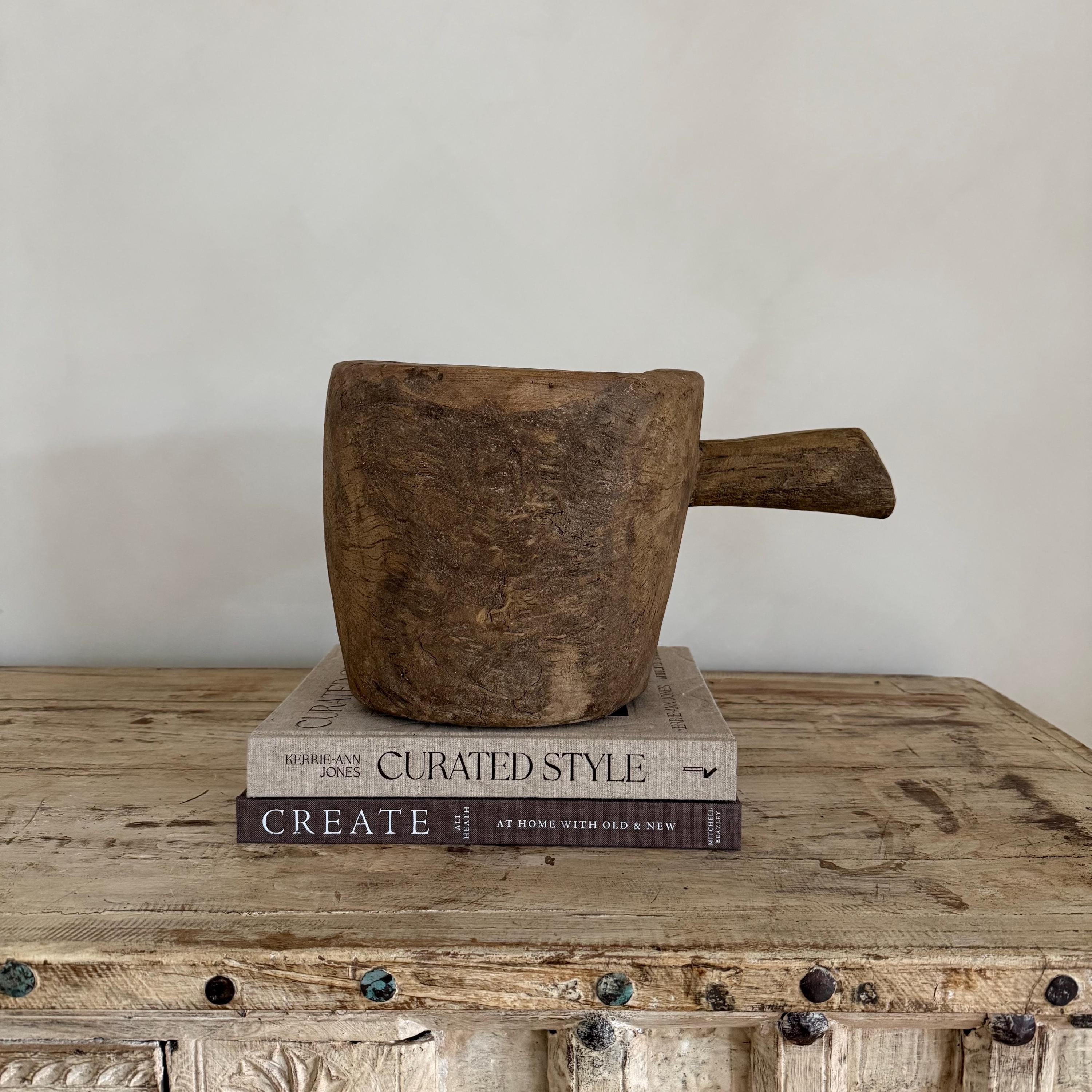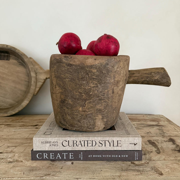 Antique Hand Carved Wooden Mortar | Vintage Rustic Grinder Bowl with Handle 12.5"