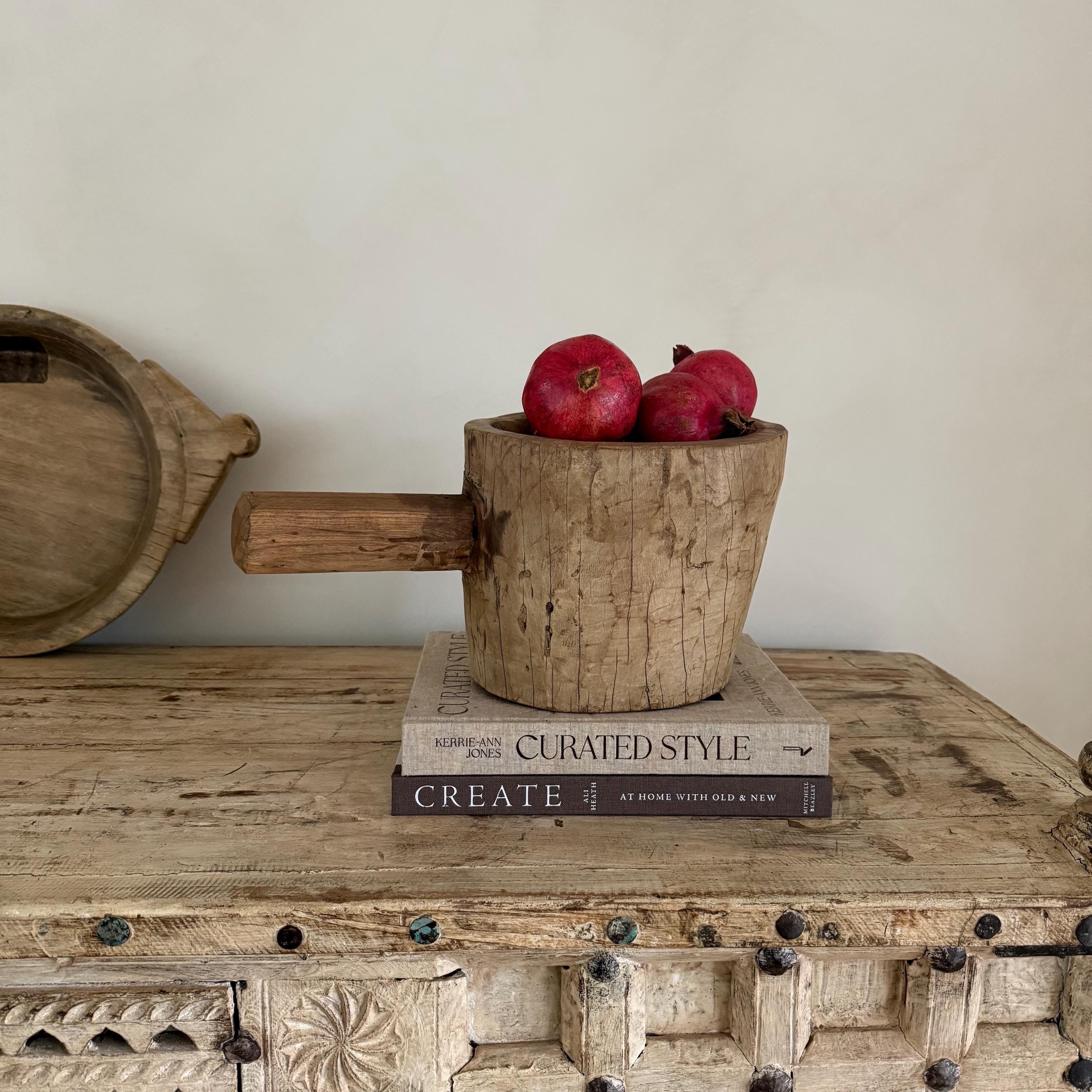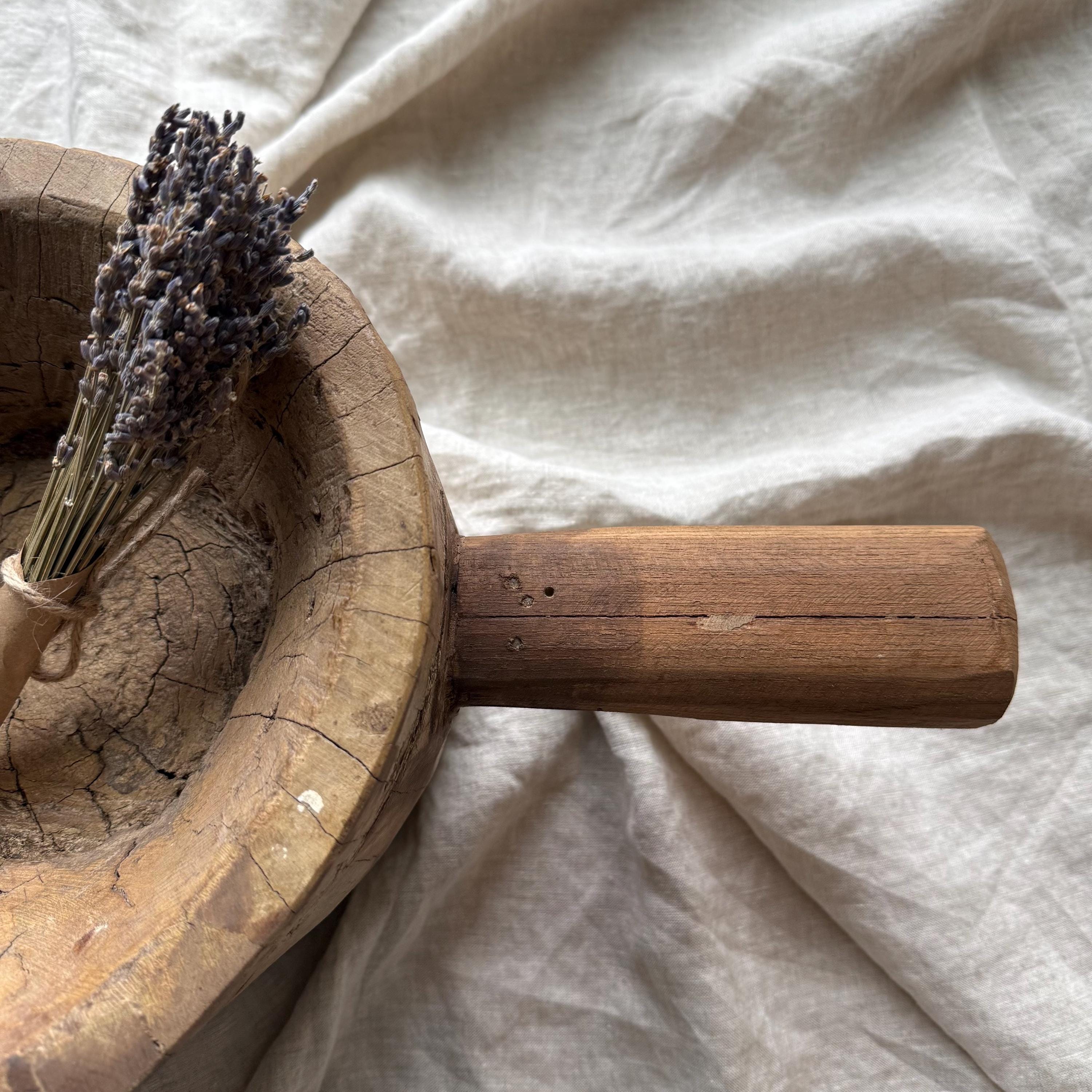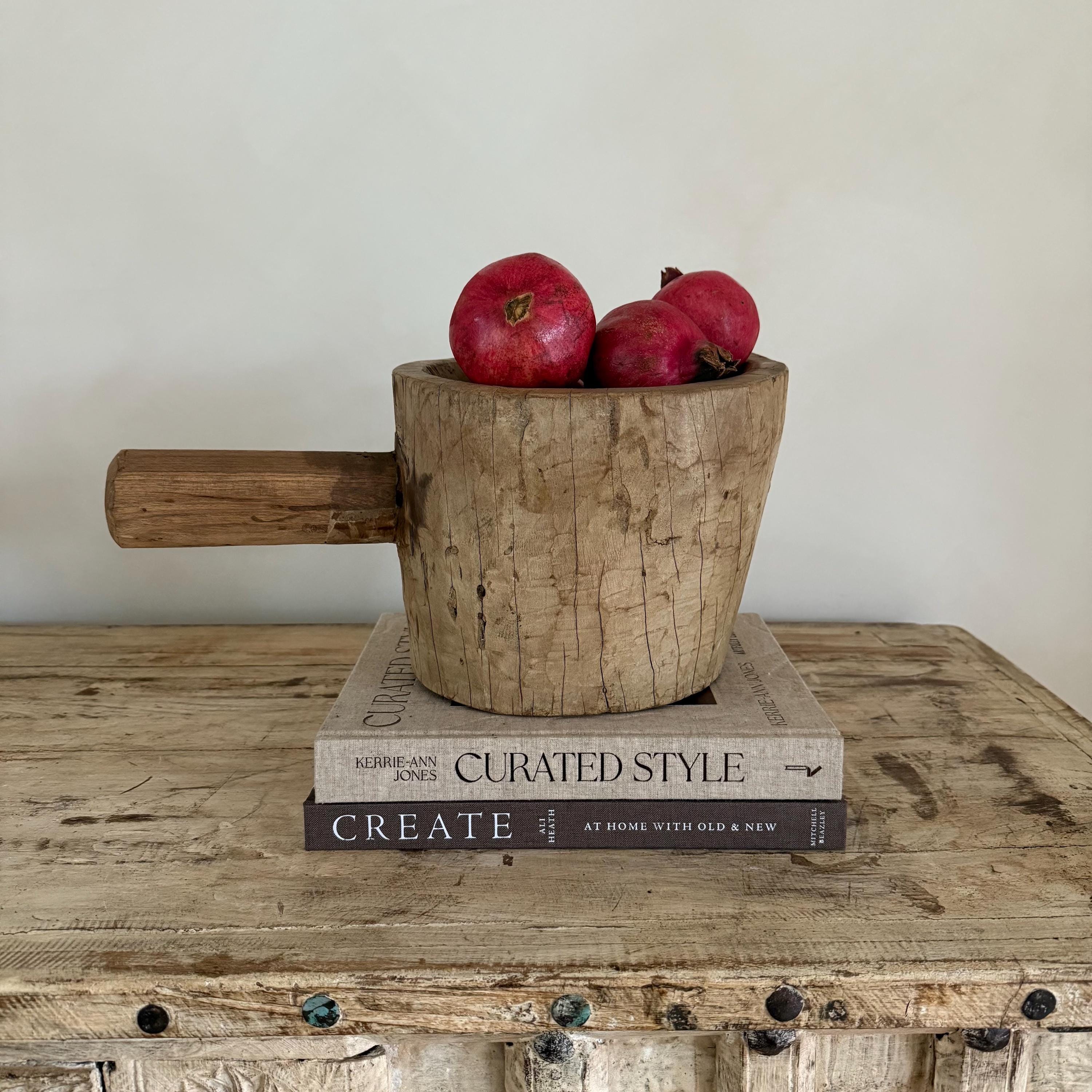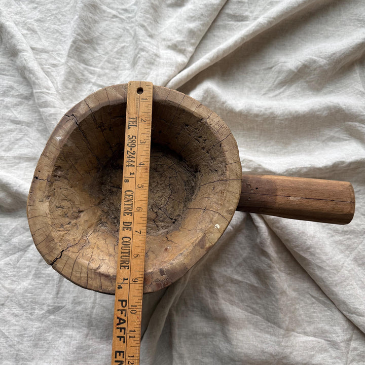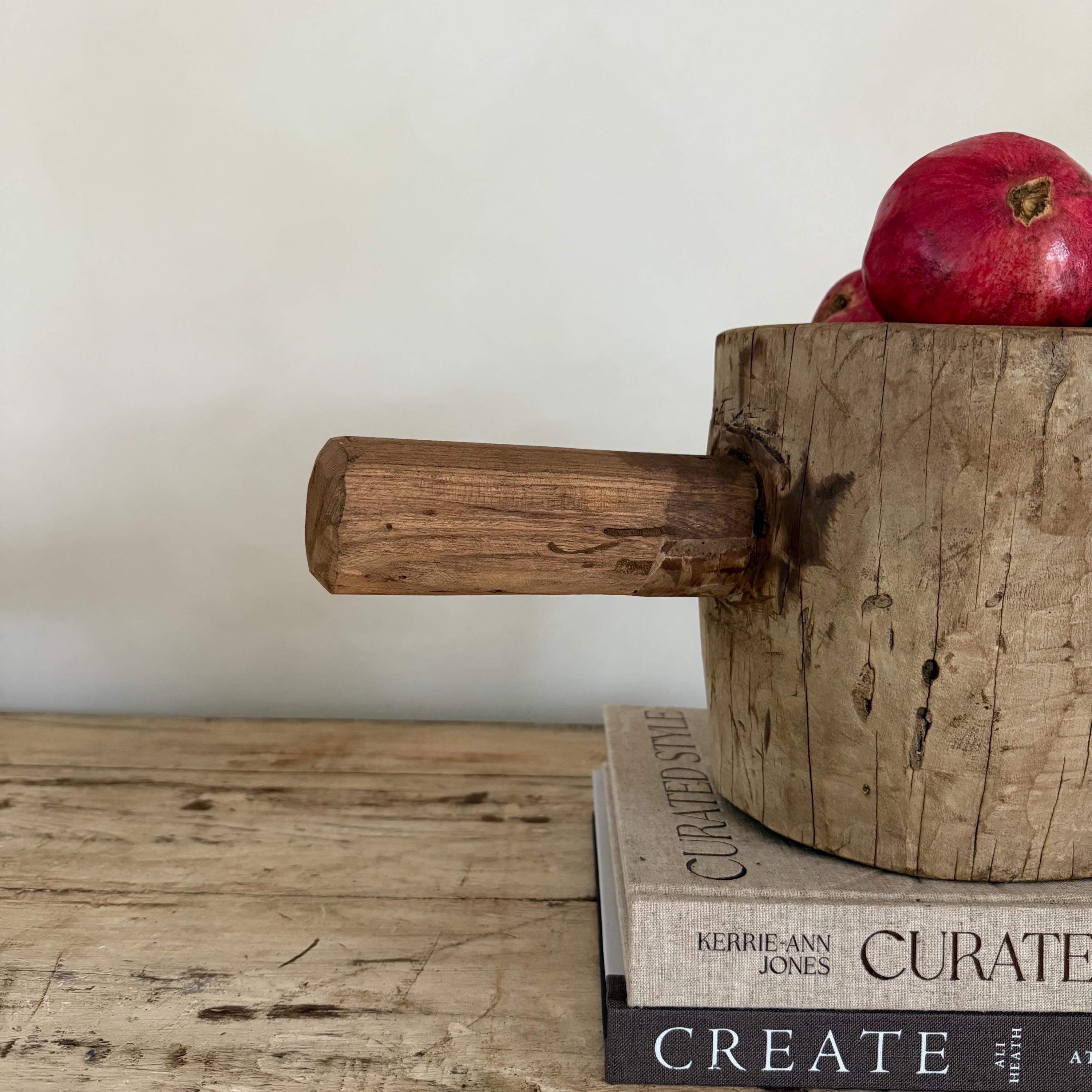 Antique Hand Carved Wooden Mortar | Vintage Rustic Grinder Bowl with Handle 14"