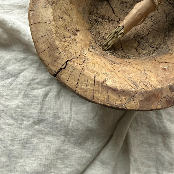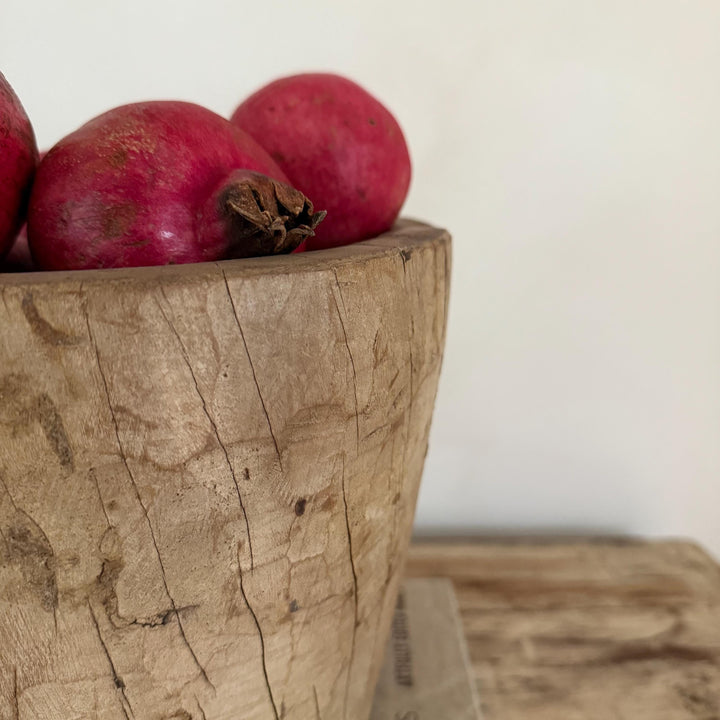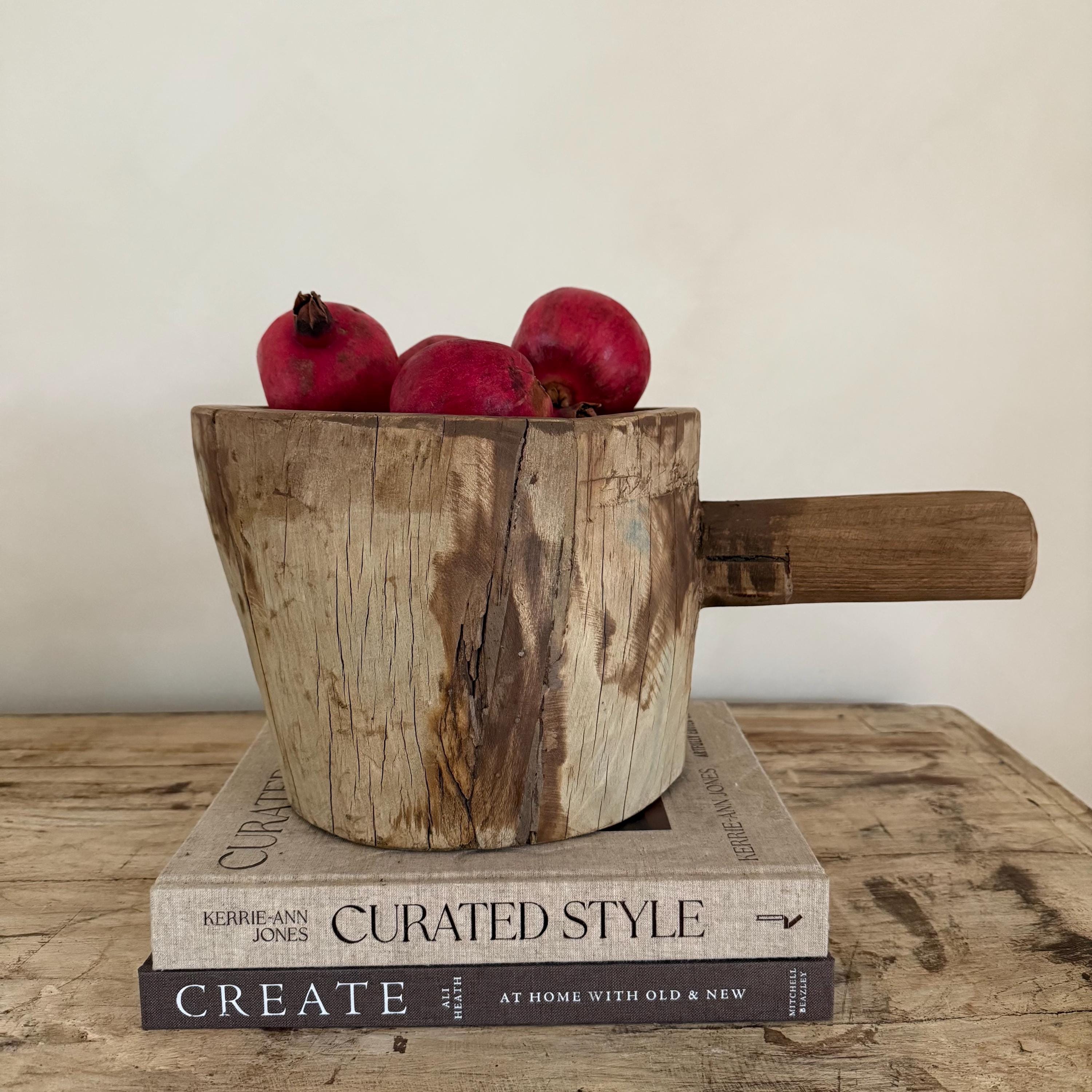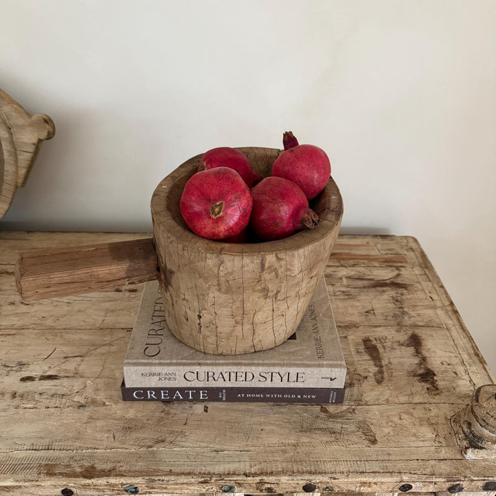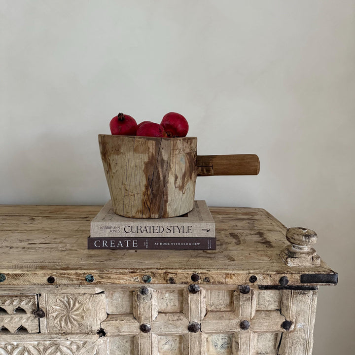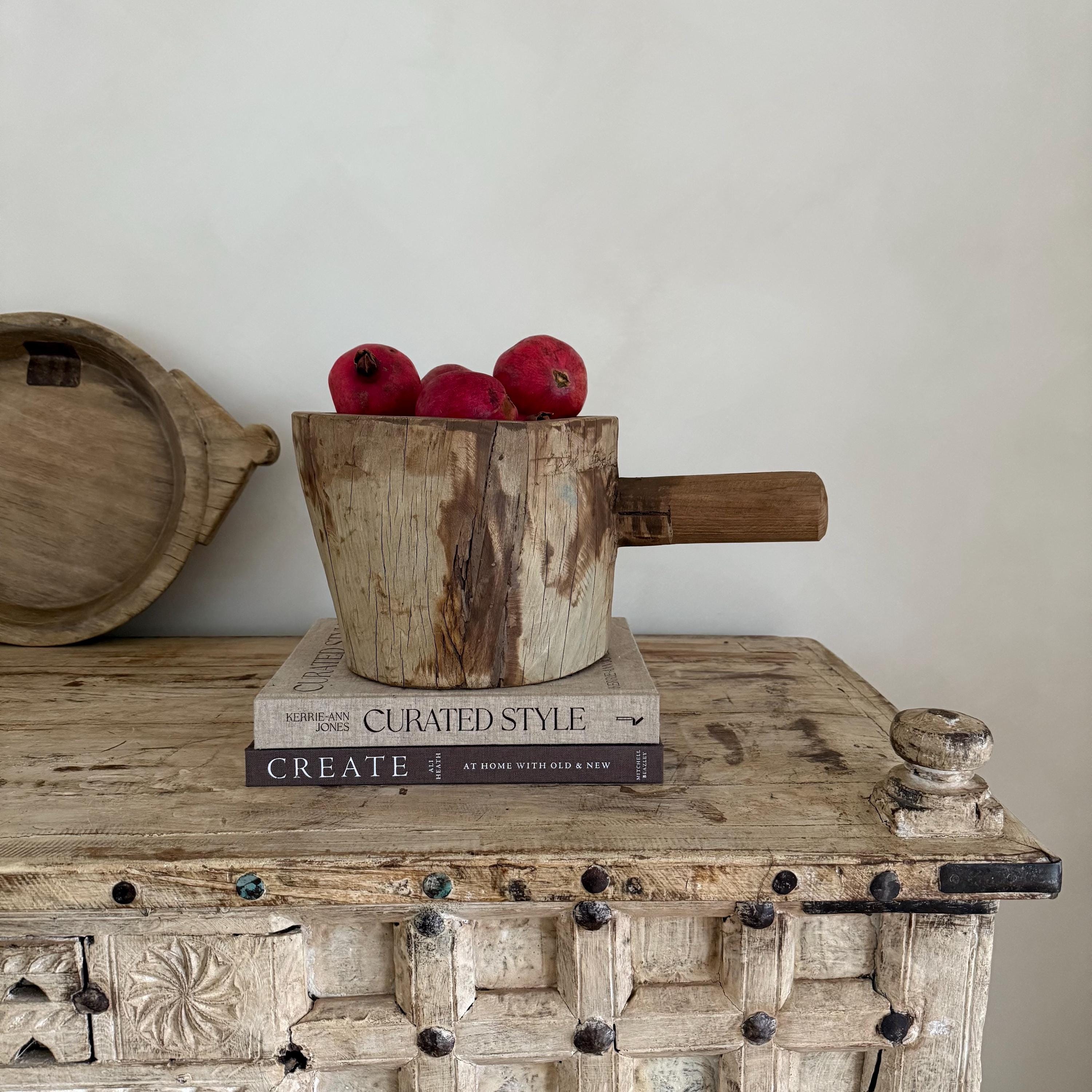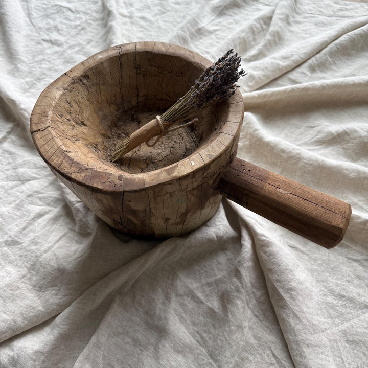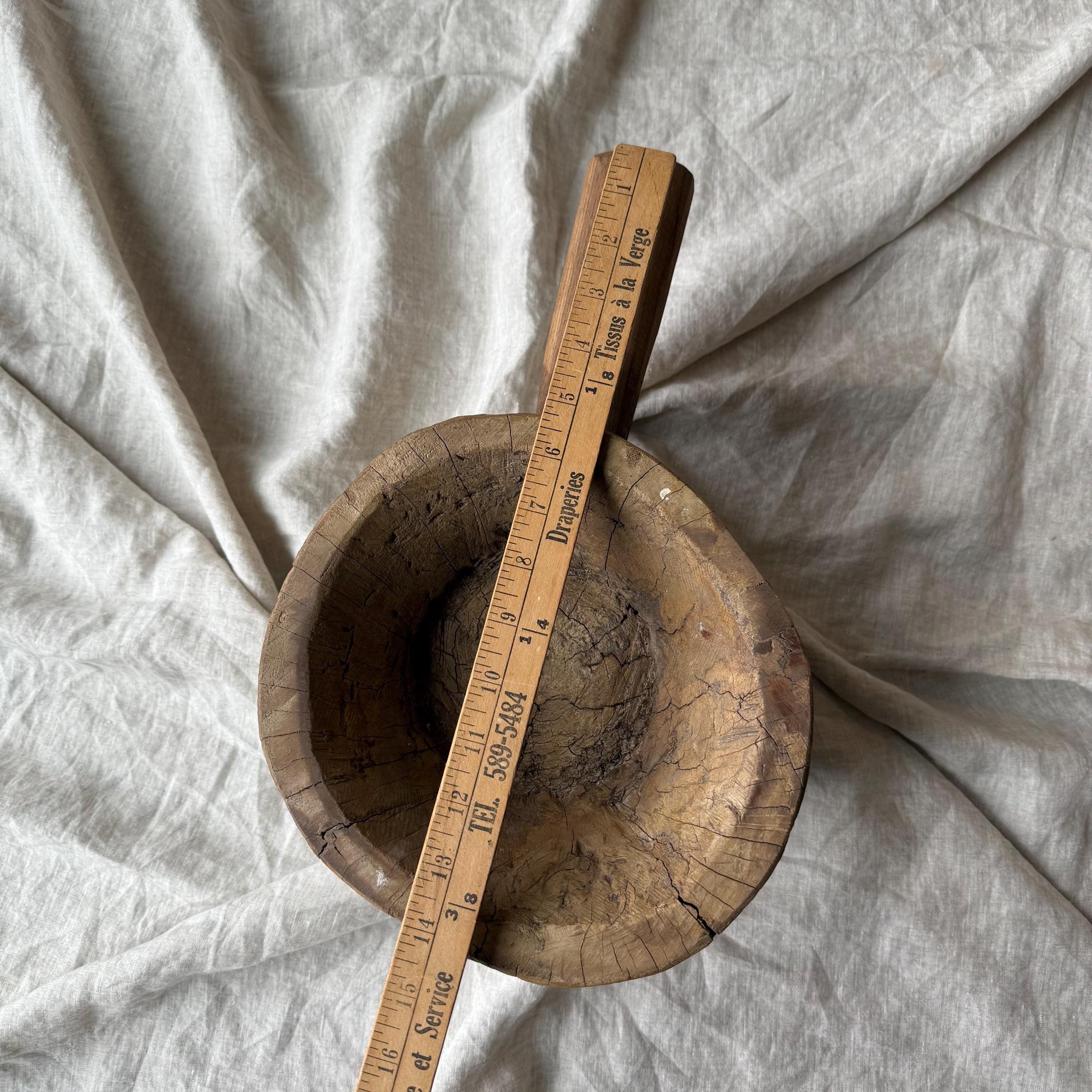 Antique Hand Carved Wooden Mortar | Vintage Rustic Grinder Bowl with Handle 14"
