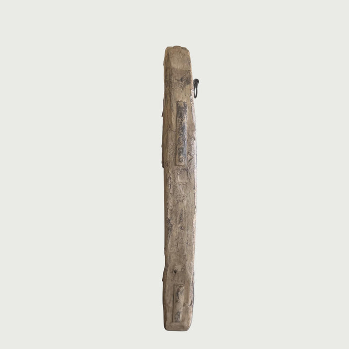 Made from reclaimed traditional cartwheels, this striking piece blends rustic wood with beautiful iron detailing that adds even more depth and character. The rich texture, carved seams, and aged patina bring an earthy warmth to any space — perfect for entryways, living rooms, or above-console styling. Expect natural wood variation, authentic imperfections, and handcrafted charm throughout.