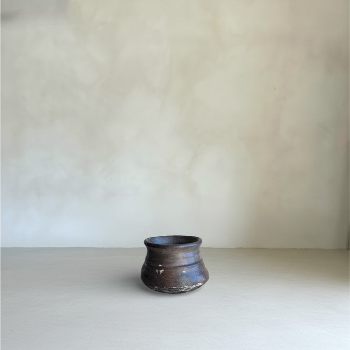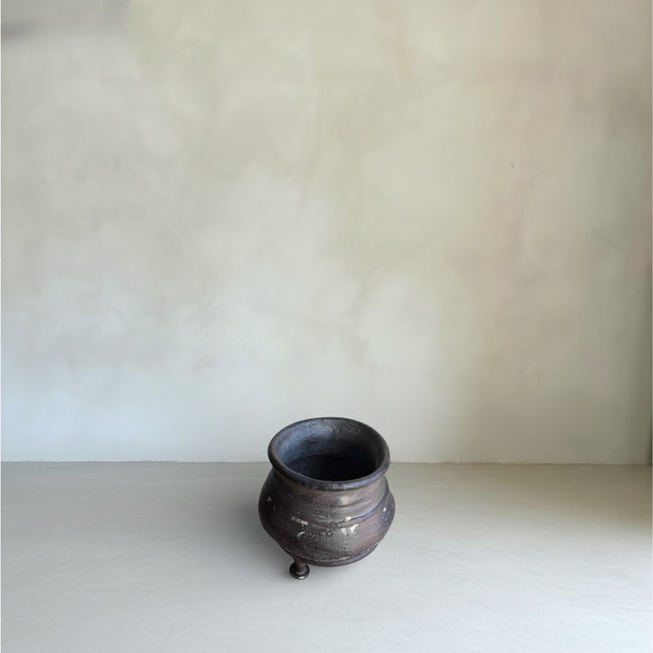 Crafted using traditional terracotta techniques, these vintage clay pots from Karnataka, India were handmade in the 1950s. They are rustic earthen vessels featuring a naturally aged patina and handcrafted imperfections that make each piece unique.