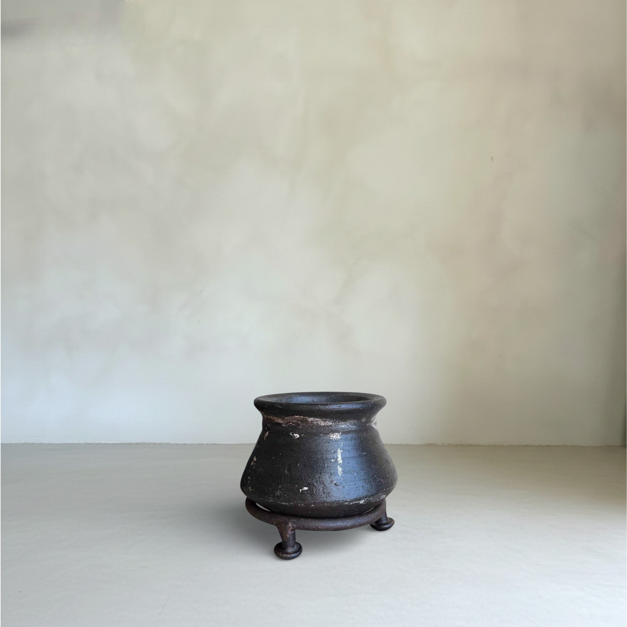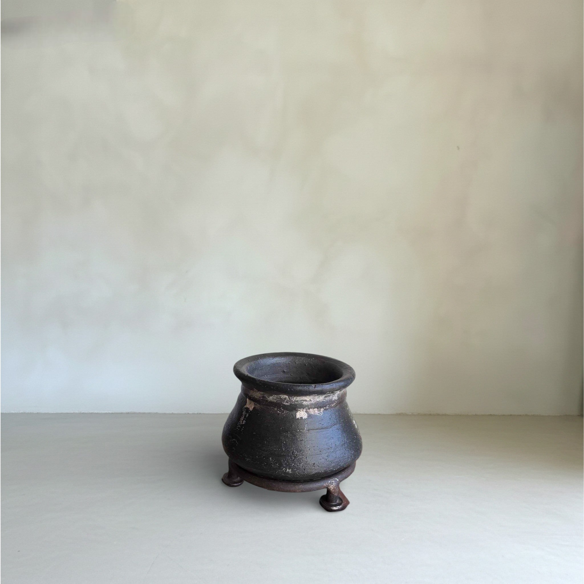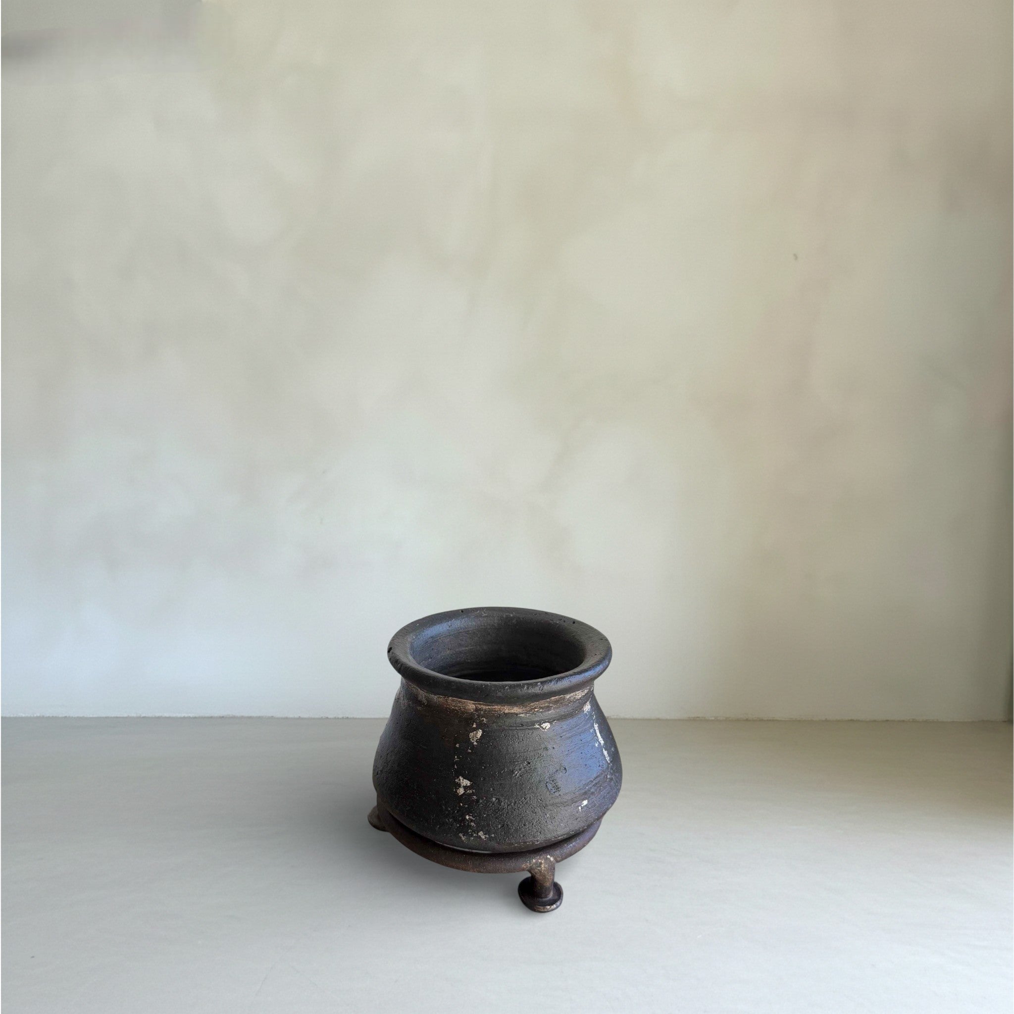 Crafted using traditional terracotta techniques, these vintage clay pots from Karnataka, India were handmade in the 1950s. They are rustic earthen vessels featuring a naturally aged patina and handcrafted imperfections that make each piece unique.