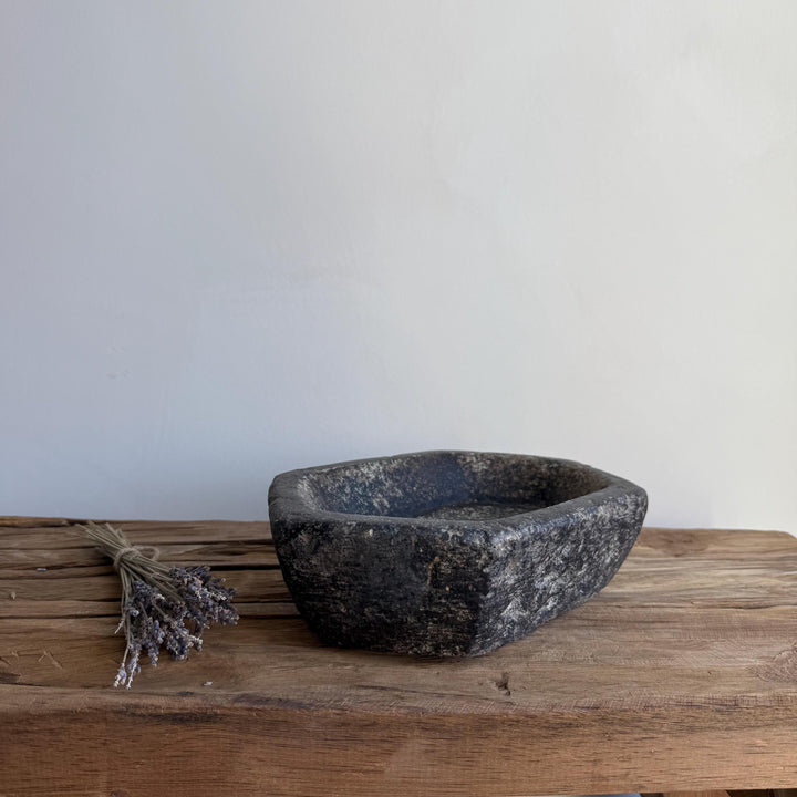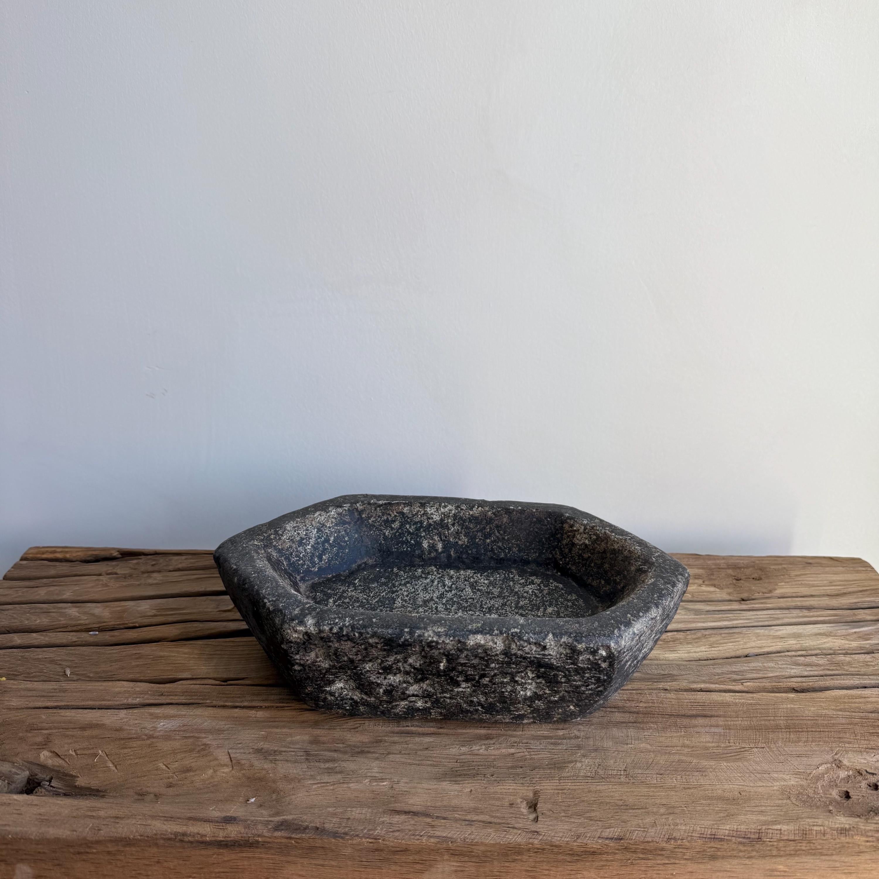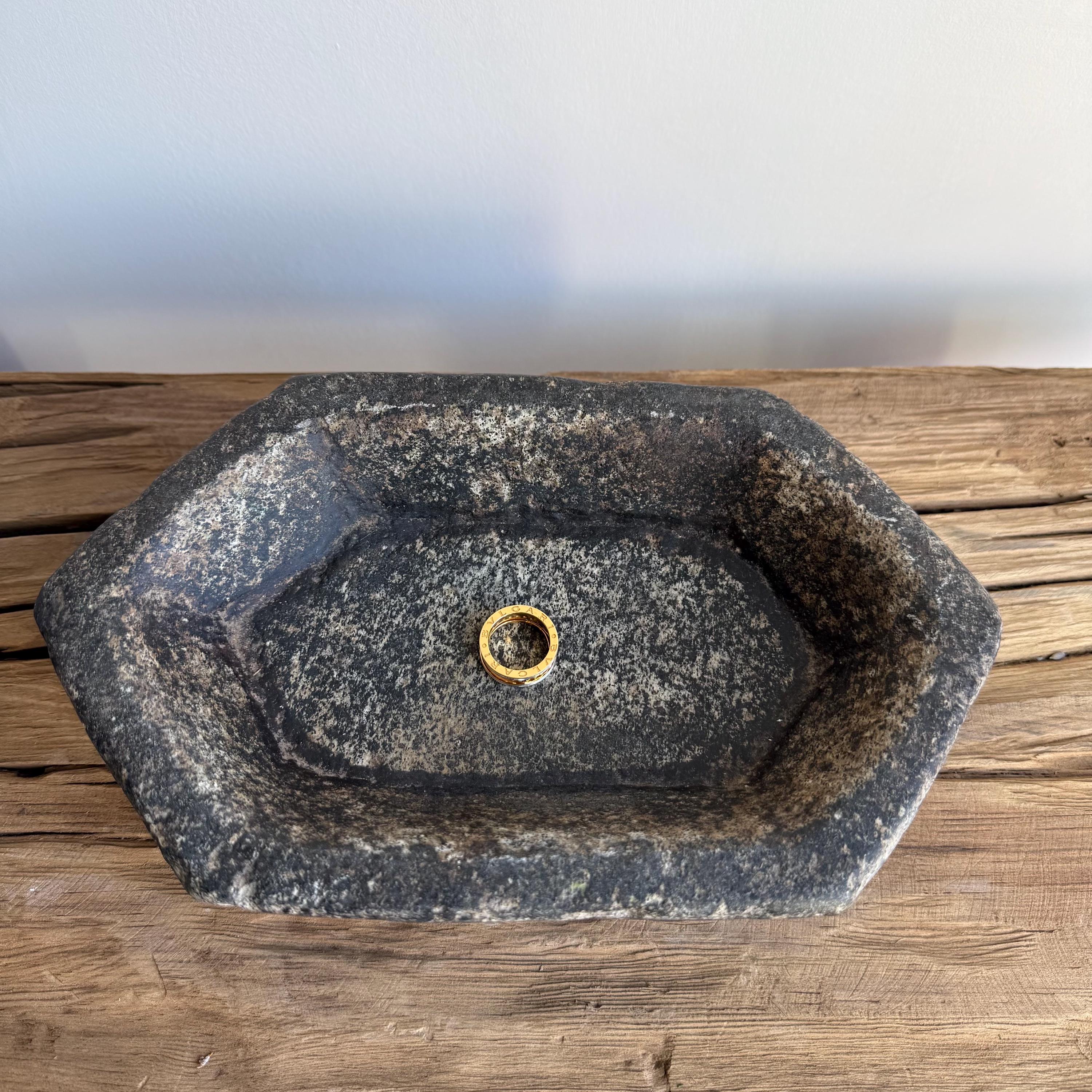 This hand-carved vintage marble stone tray carries a naturally aged beauty, making it a timeless accent for any space. Shaped from raw stone, its weathered surface and earthy hues bring an organic elegance, complementing wabi-sabi, farmhouse, or minimalist interiors. Once used as a utilitarian dish, it now shines as a decorative catchall, jewelry holder, or sculptural piece. Each tray is one-of-a-kind, showcasing a rich patina, subtle variations, and marks of age that highlight its history and artisanal craftsmanship.