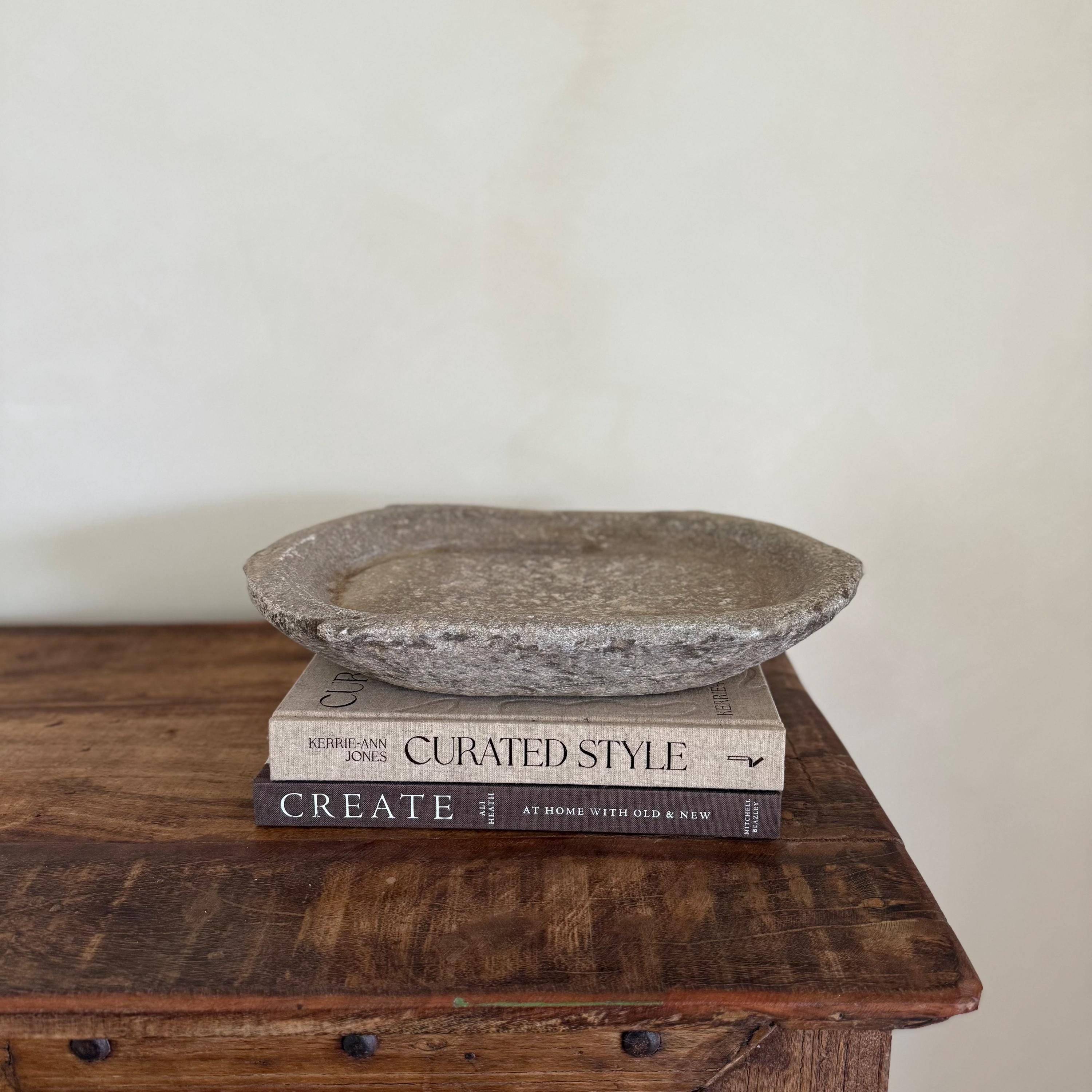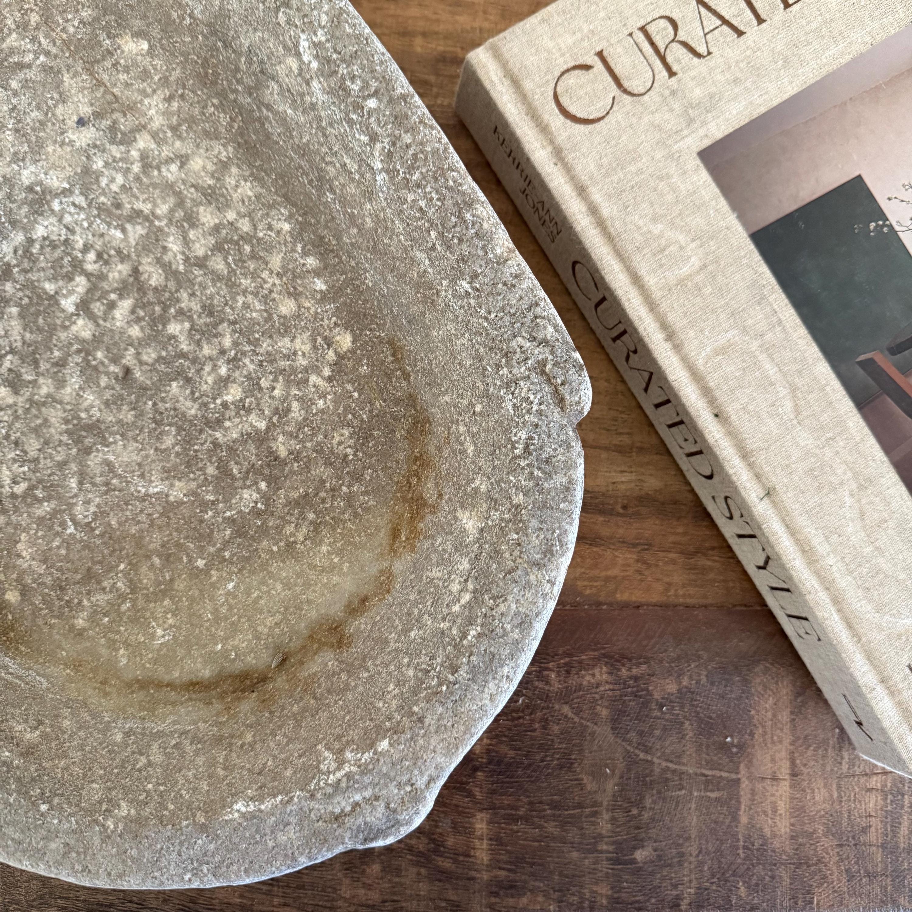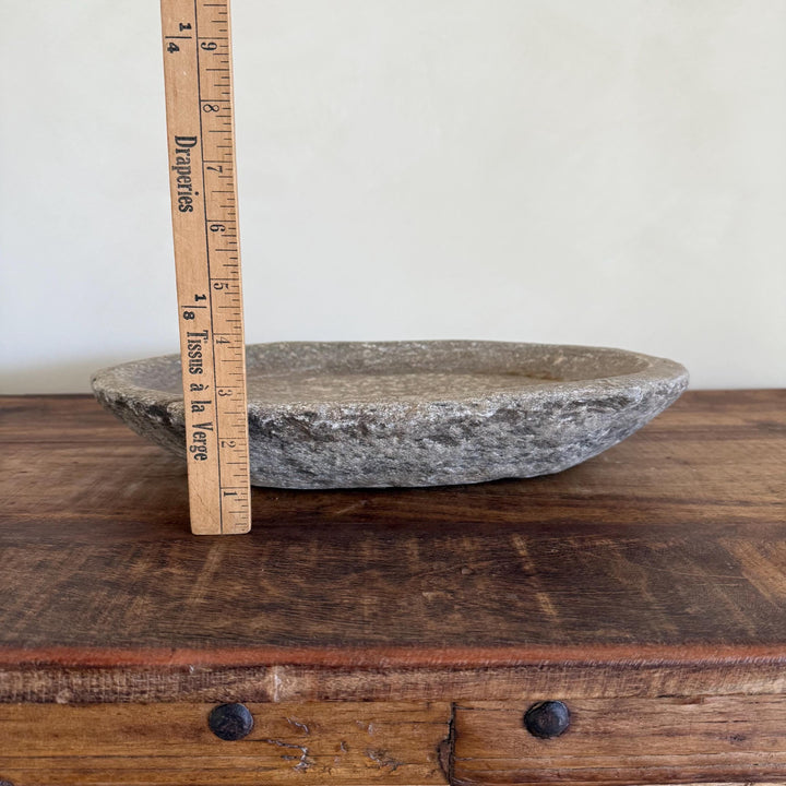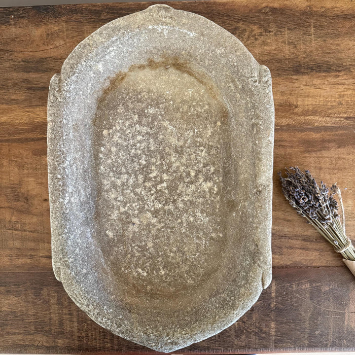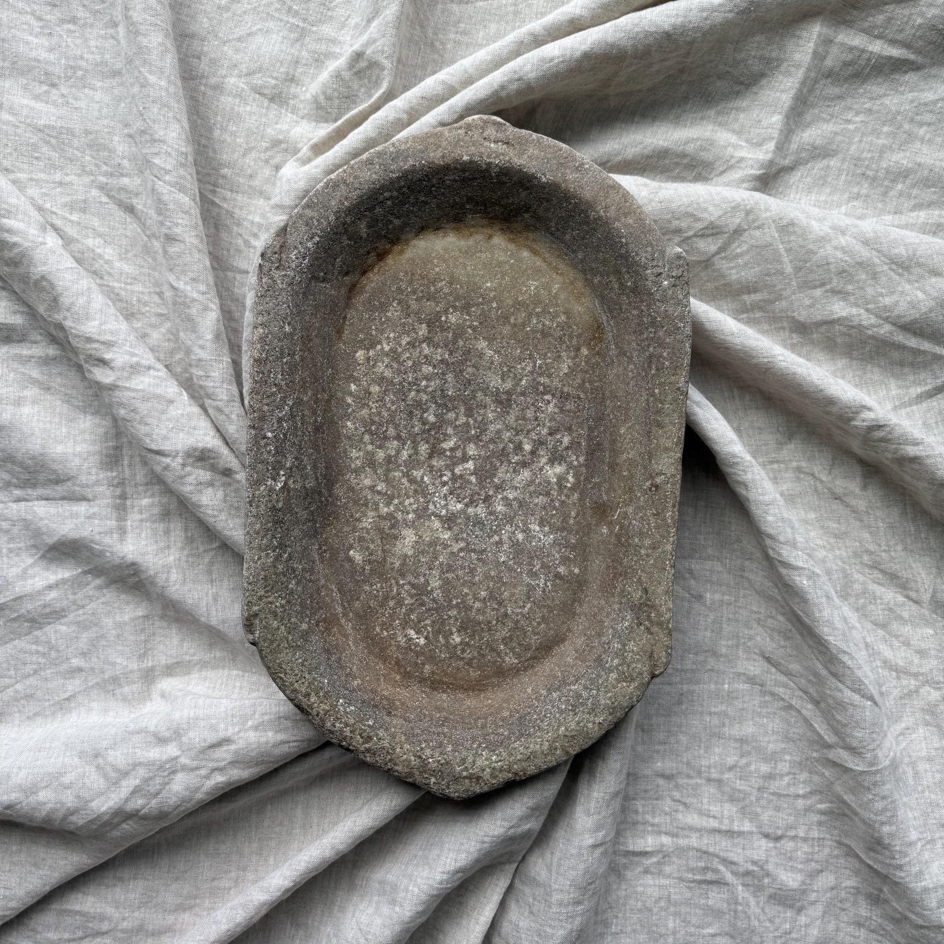 Vintage Marble Kharal Stone Tray, Antique Limestone Carved Oval Tray, Primitive Marble Centerpiece