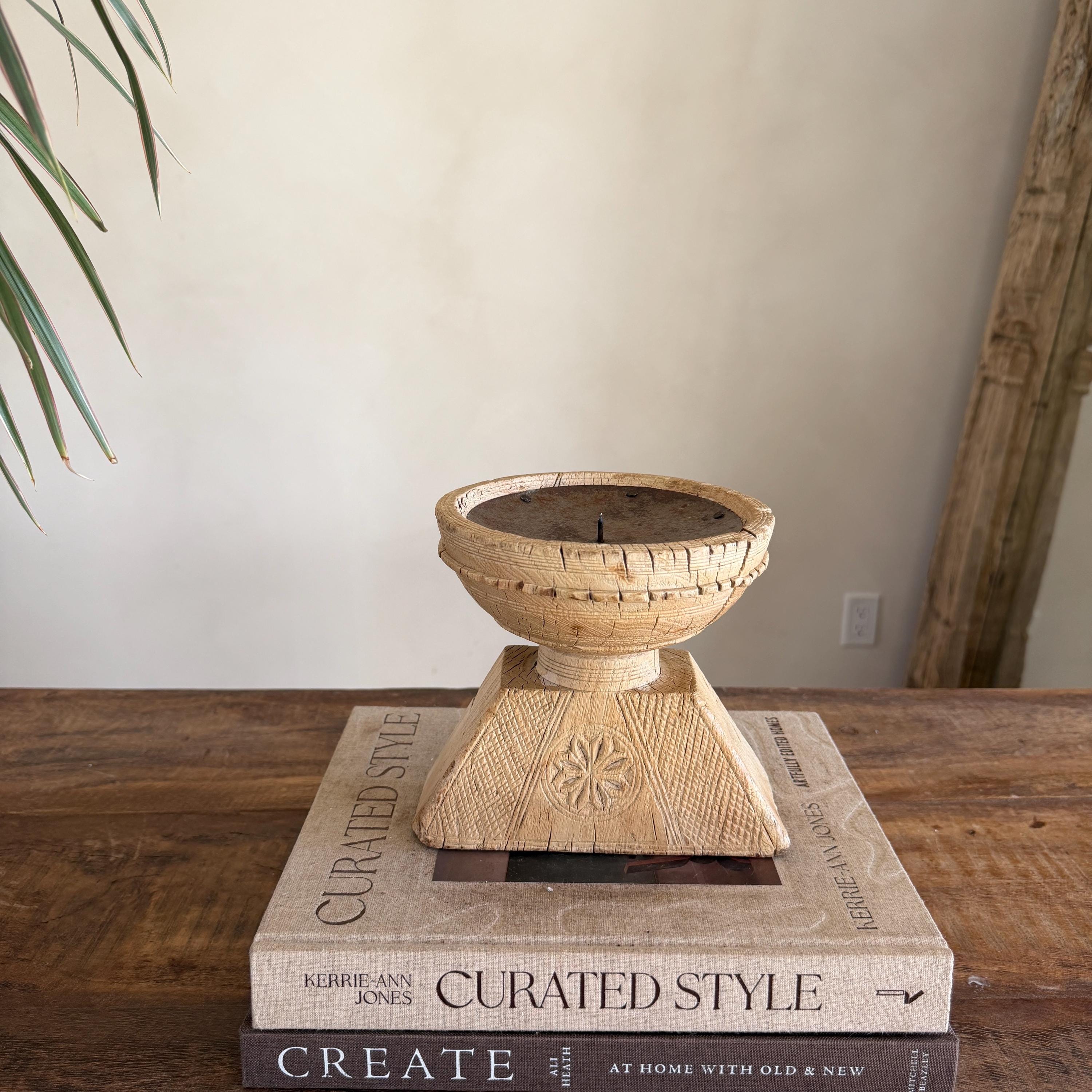 Bijani Carved Candle Holder was once a seeder tool used in the fertile farmlands of Rajasthan, hand-carved by farmers themselves. These carvings were more than decorative, they were a personal testament to their daily bread and butter, adding individuality and meaning to the tools that sustained their livelihoods.