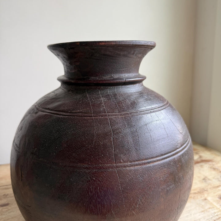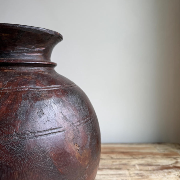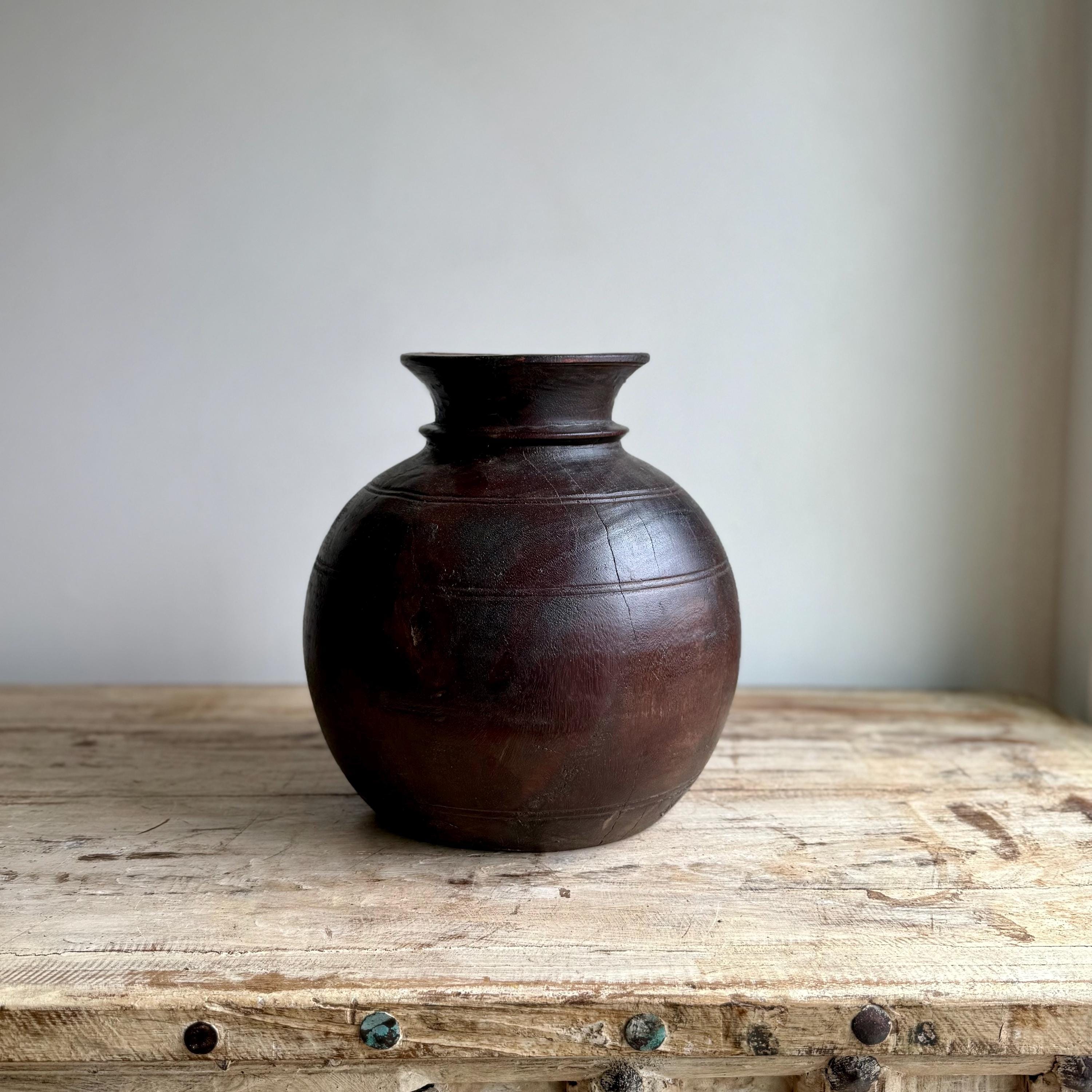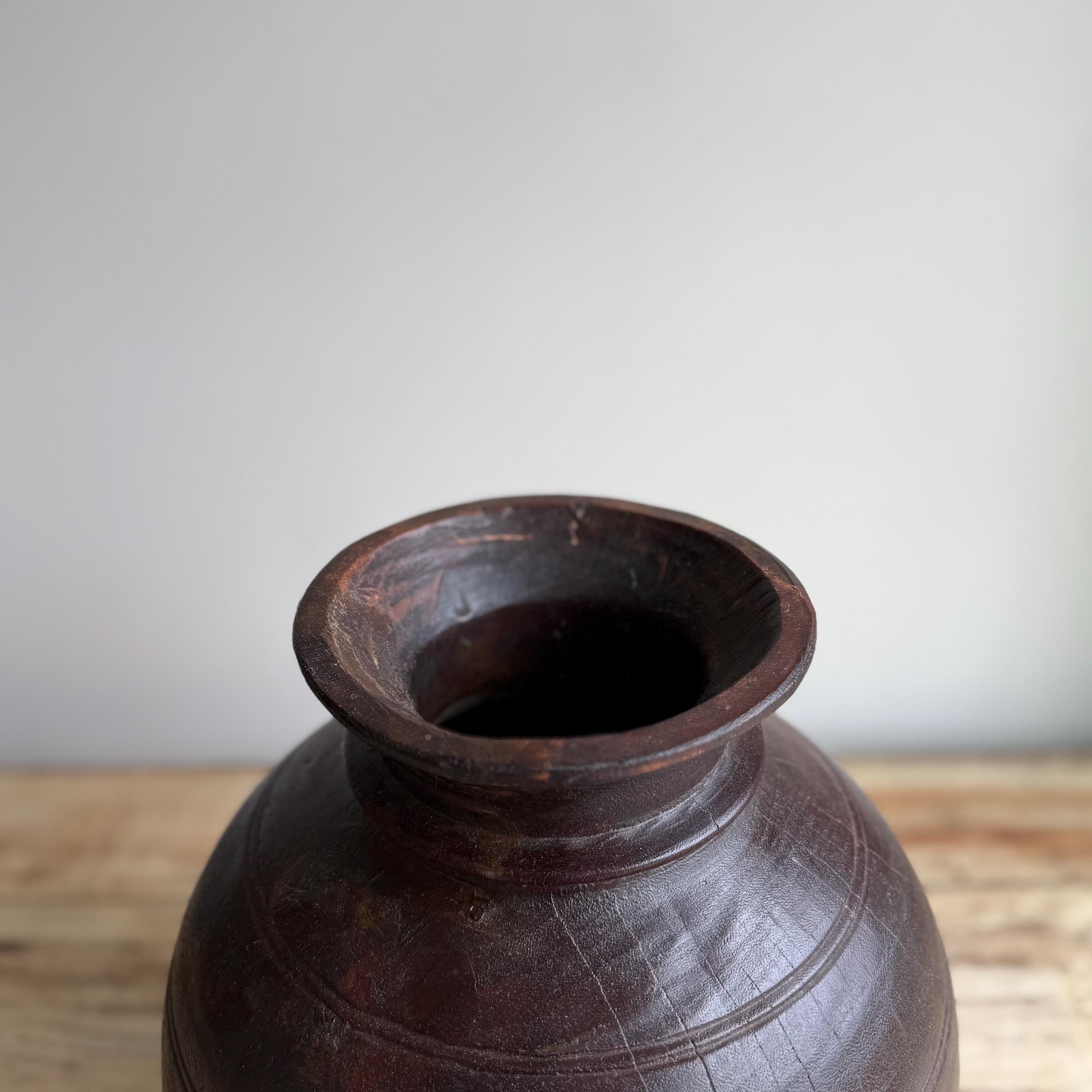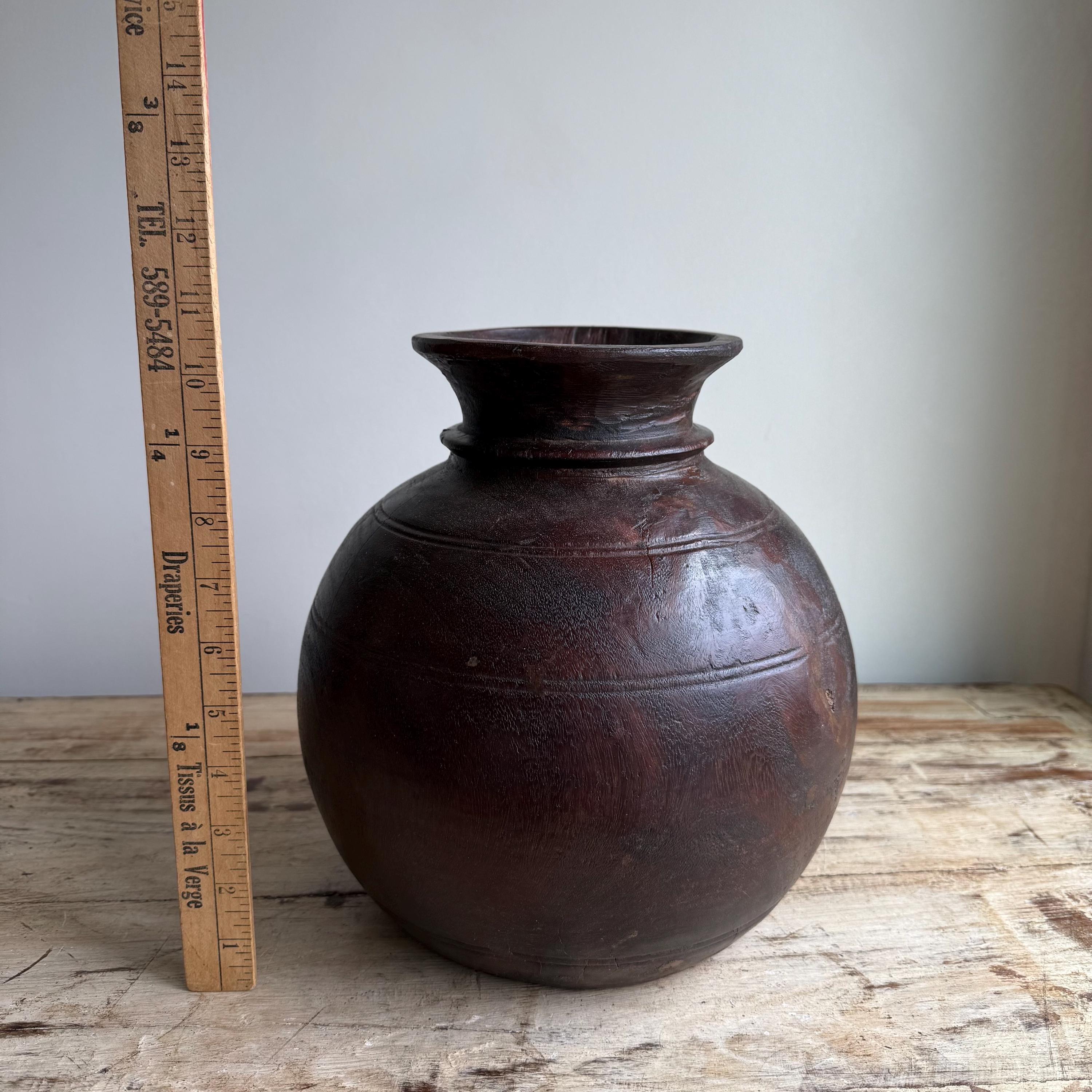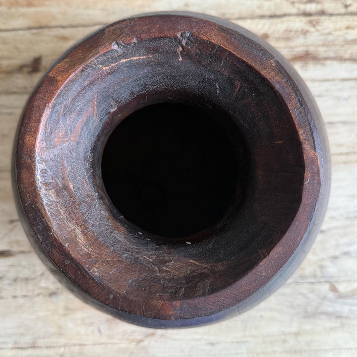 Vintage Wooden 10" Water Pot, Hand Carved Wood Vase, Rustic Antique Planter ,Wabi Sabi Vessel
