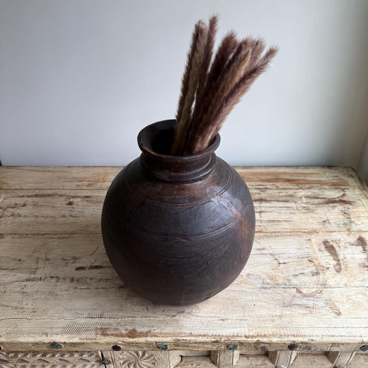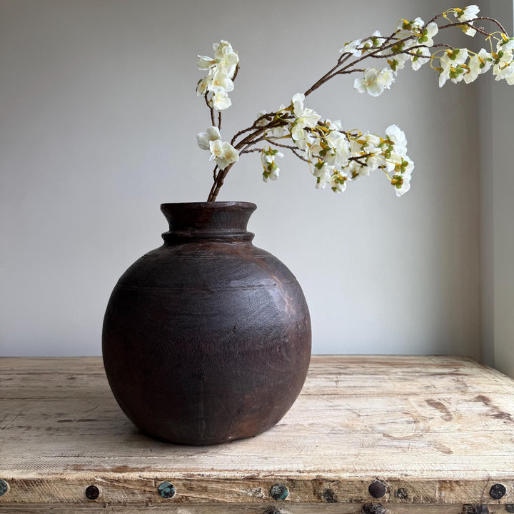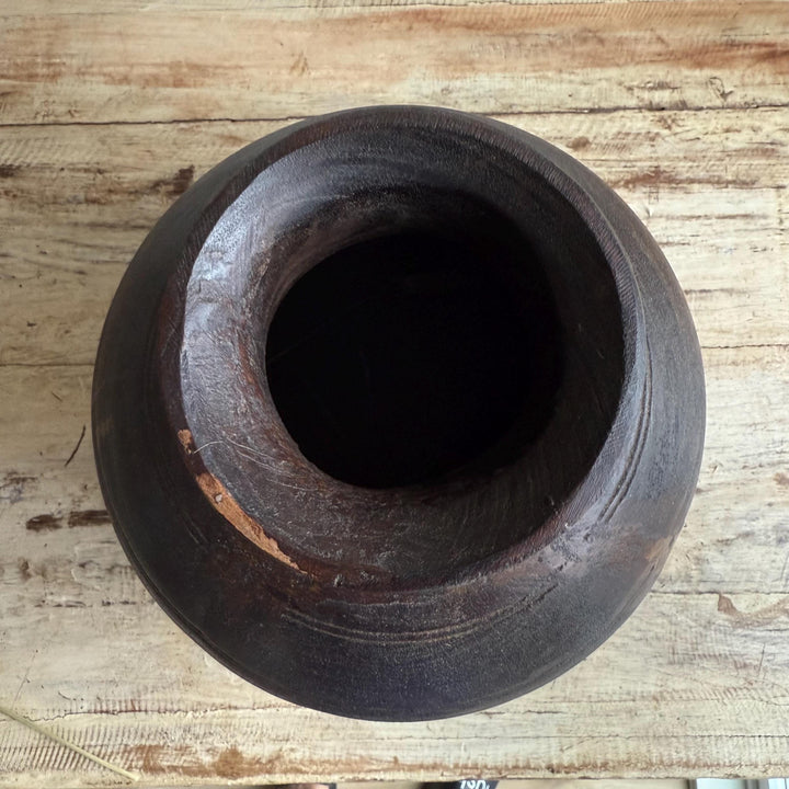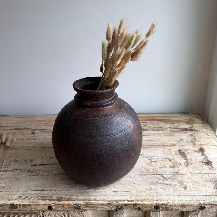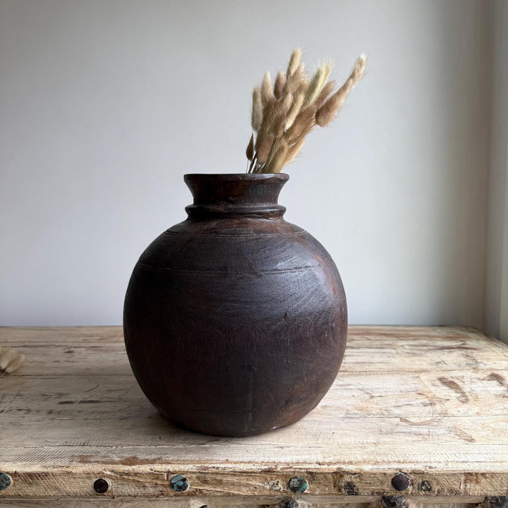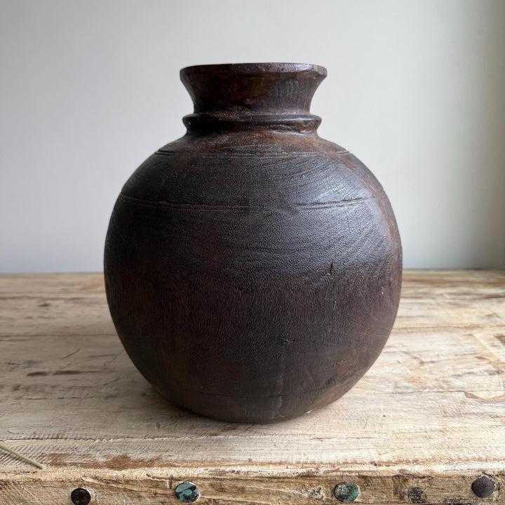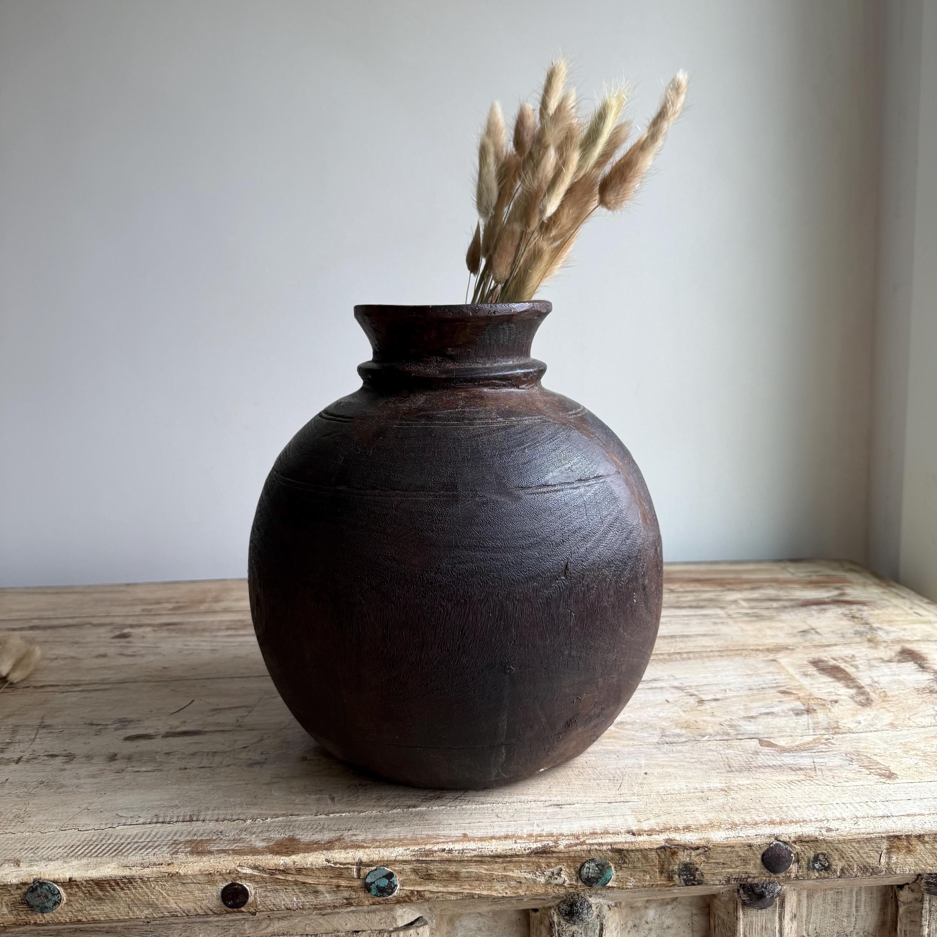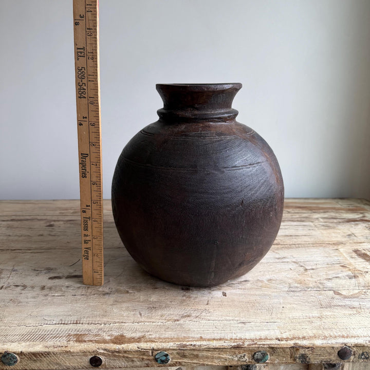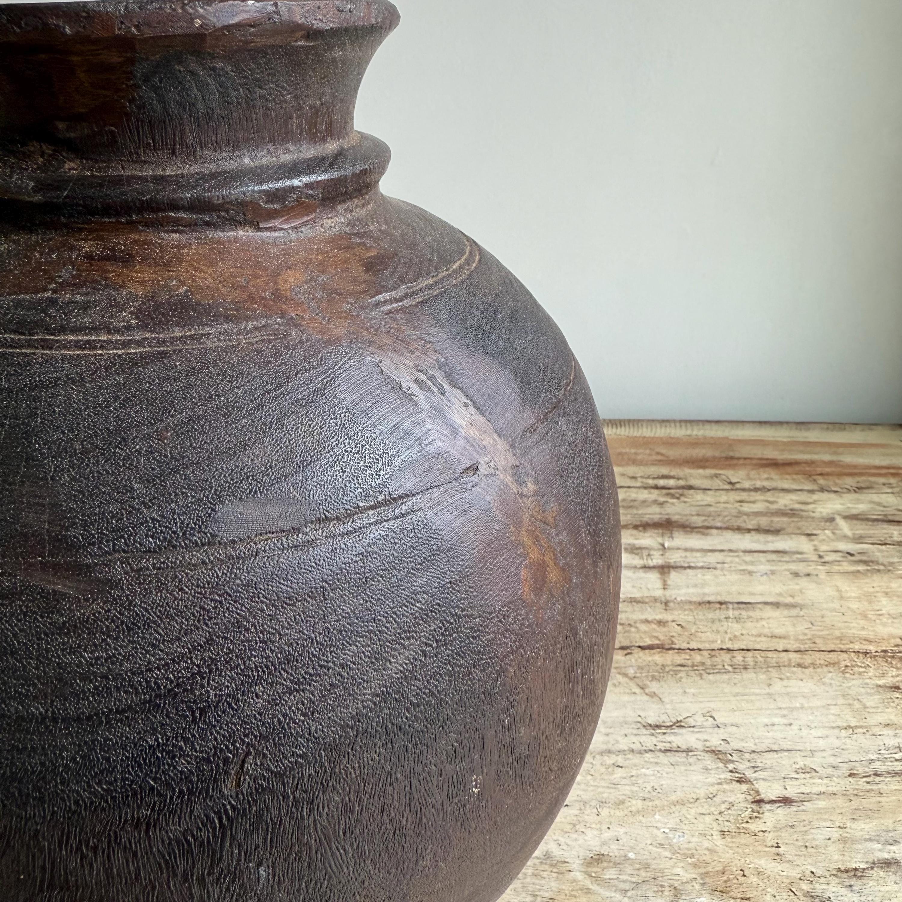 Vintage Wooden 11" Water Pot, Hand Carved Wood Vase, Rustic Antique Planter ,Wabi Sabi Vessel