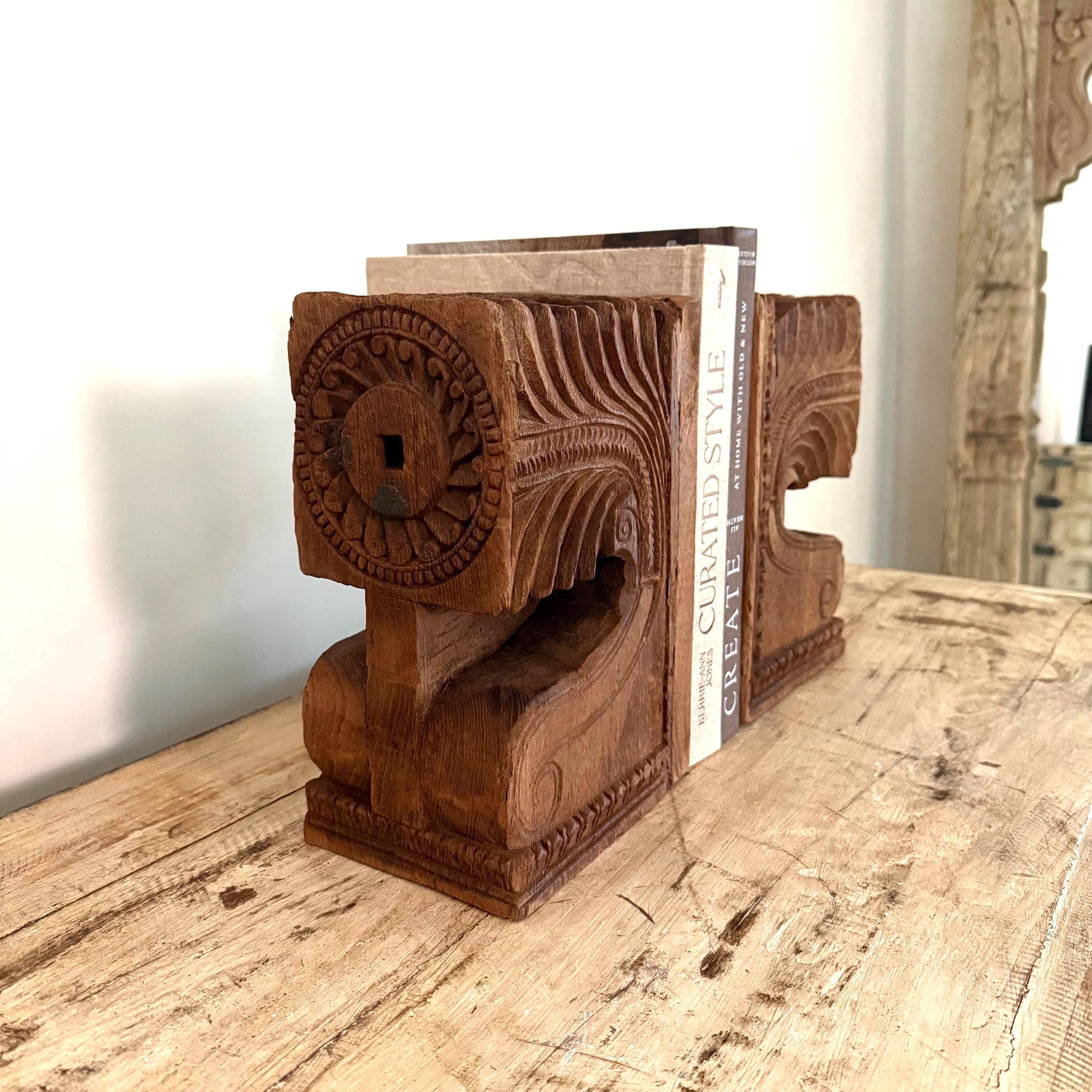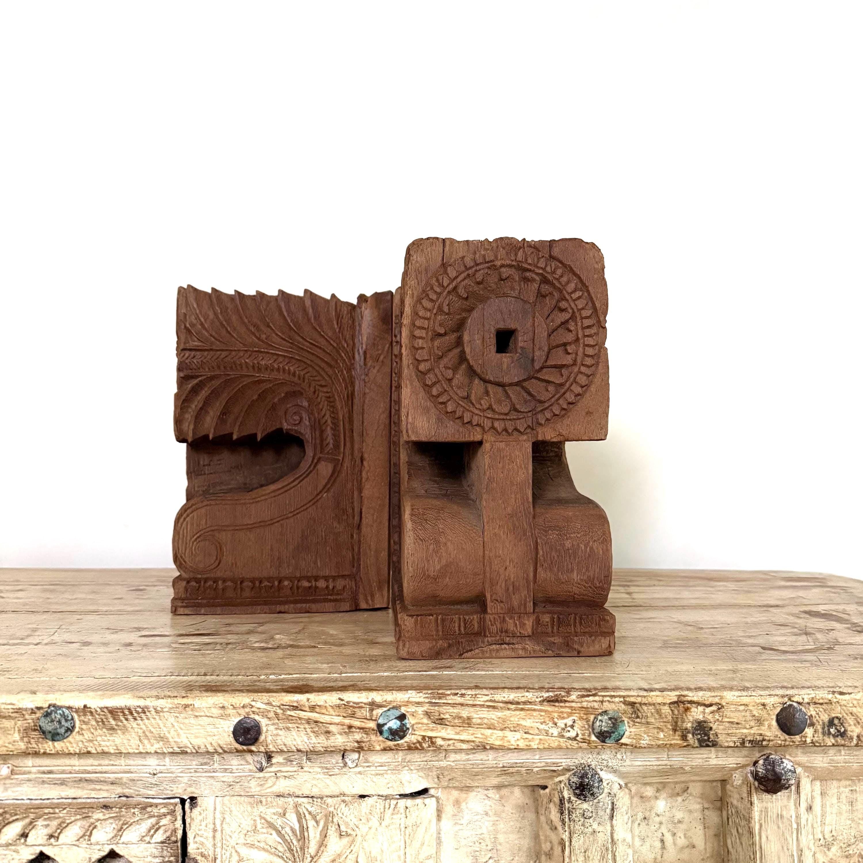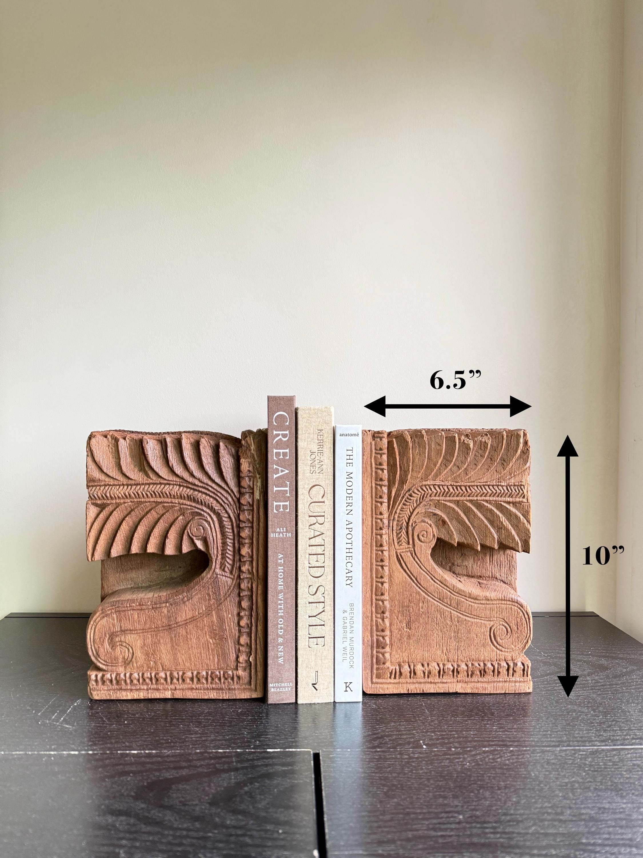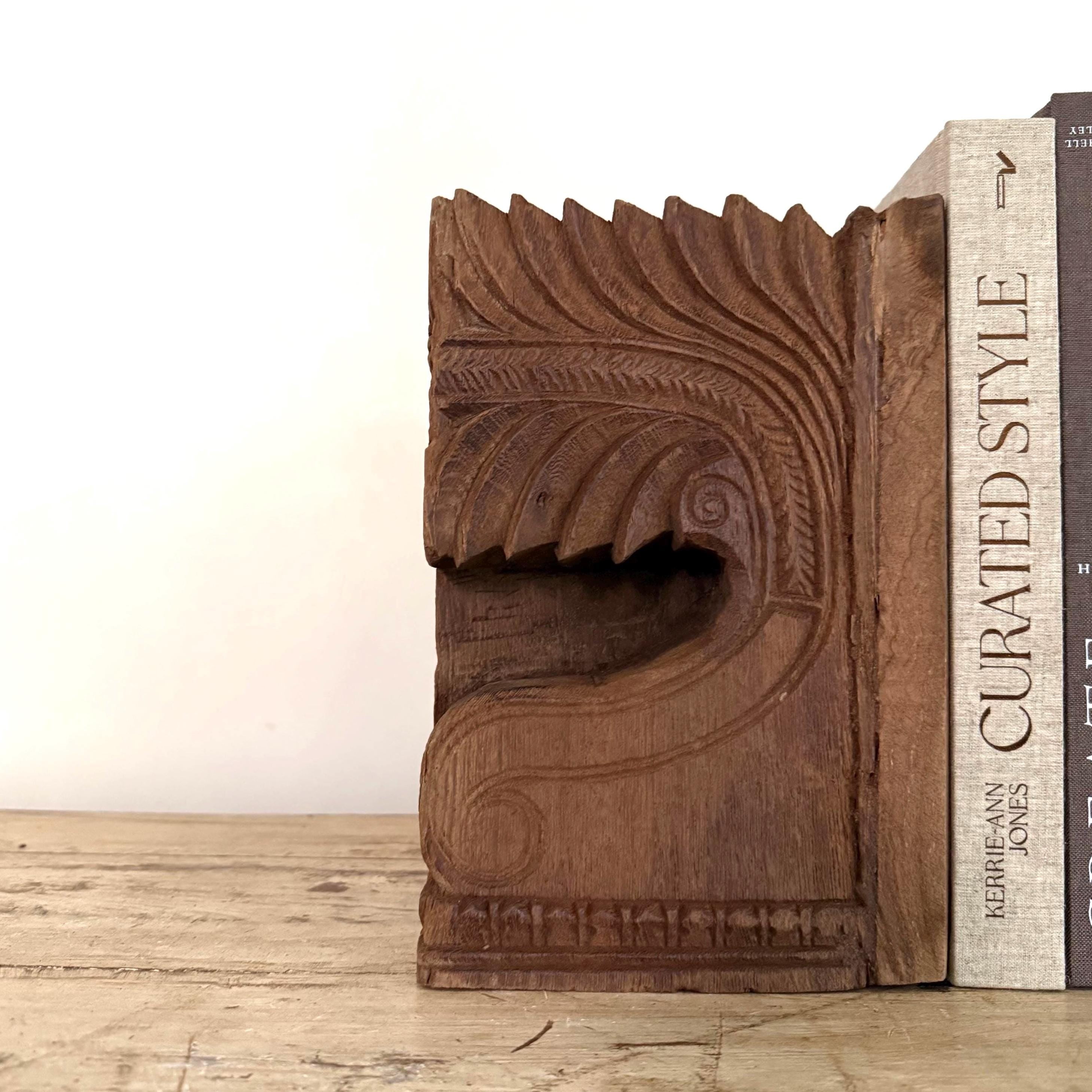 Add a touch of history and craftsmanship to your home with these one-of-a-kind Vintage Carved Bookends, repurposed from old Indian temple corbels. Originally used to support rails, balconies, and other architectural structures, these corbels have been thoughtfully transformed into functional and stunning bookends. Each piece carries intricate carvings that showcase the rich artistic traditions of India, making them a unique addition to any bookshelf or display.