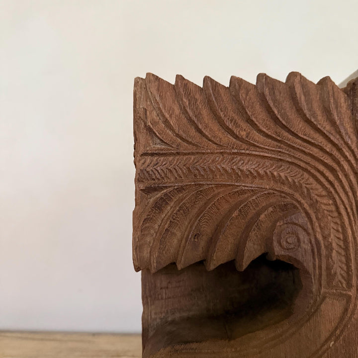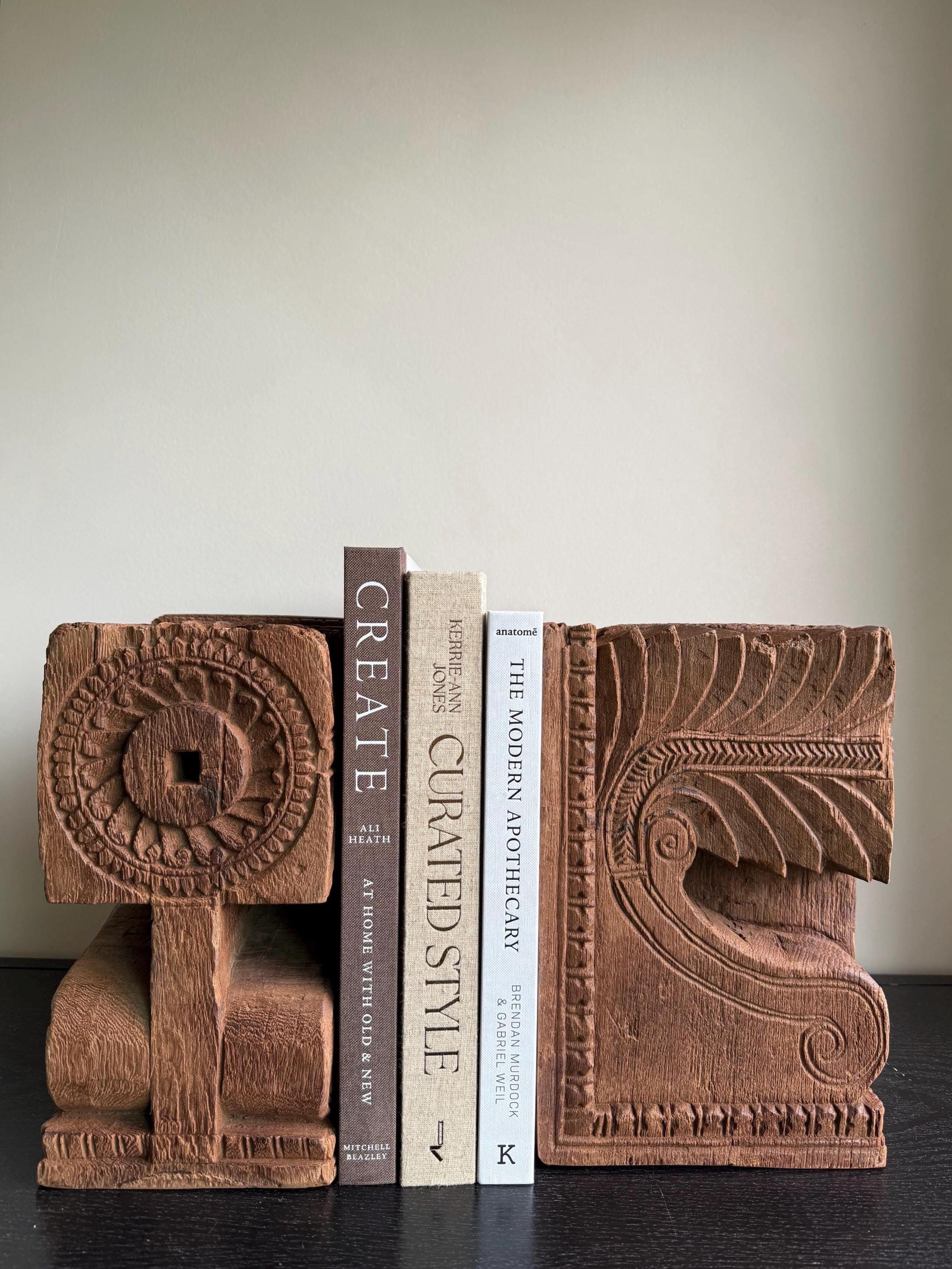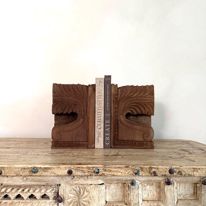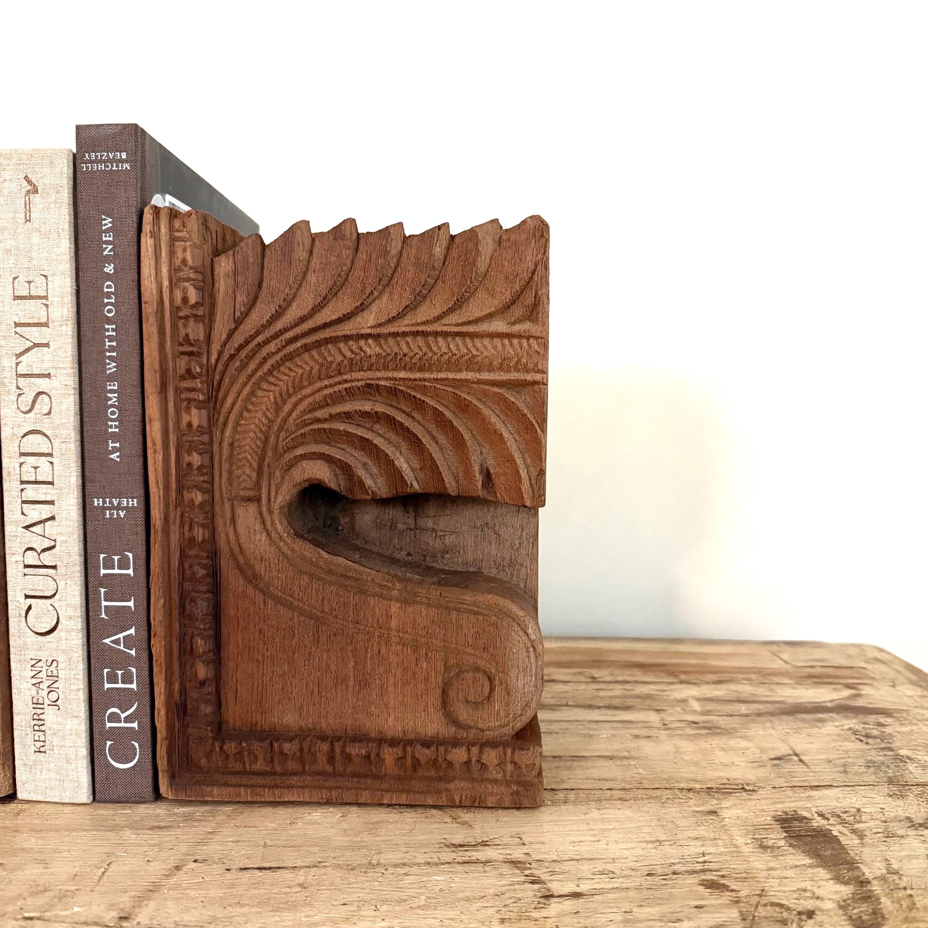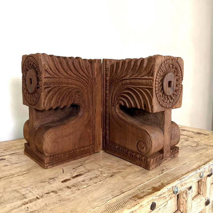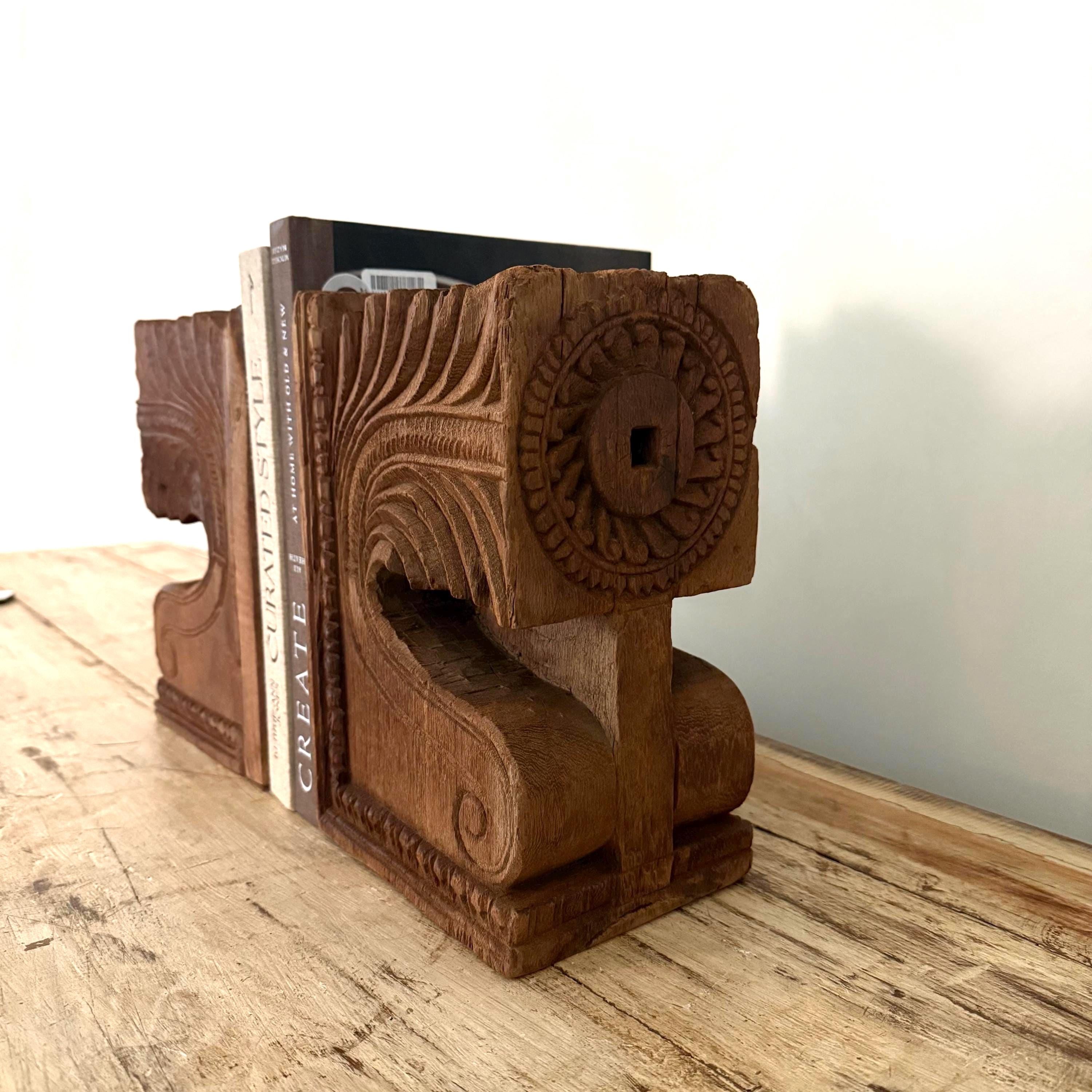 Add a touch of history and craftsmanship to your home with these one-of-a-kind Vintage Carved Bookends, repurposed from old Indian temple corbels. Originally used to support rails, balconies, and other architectural structures, these corbels have been thoughtfully transformed into functional and stunning bookends. Each piece carries intricate carvings that showcase the rich artistic traditions of India, making them a unique addition to any bookshelf or display.