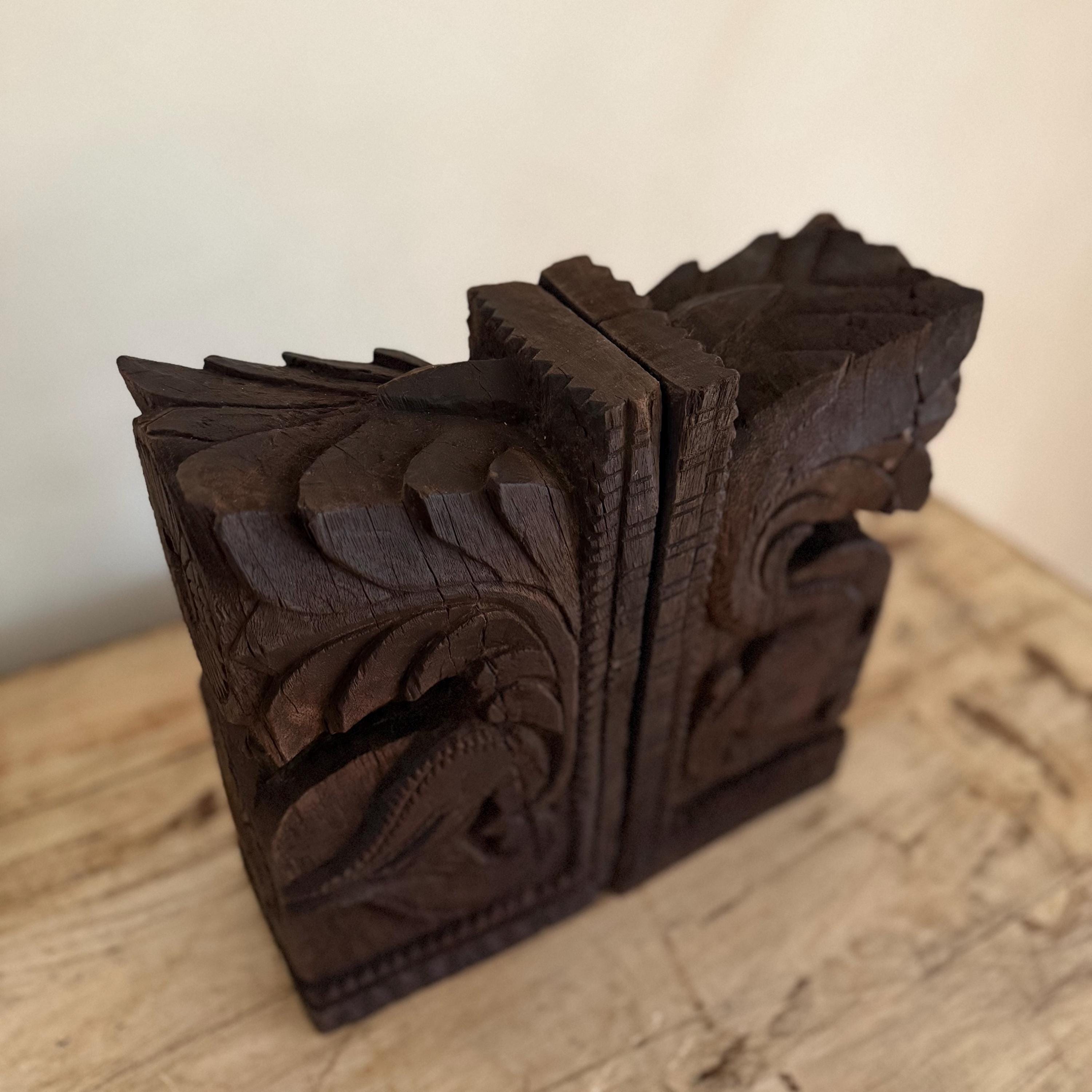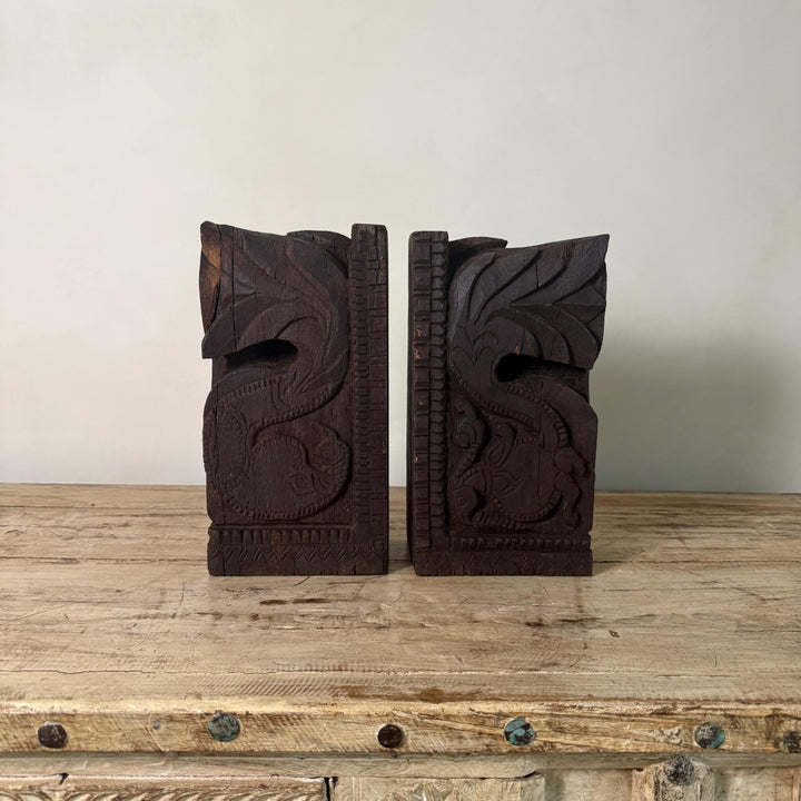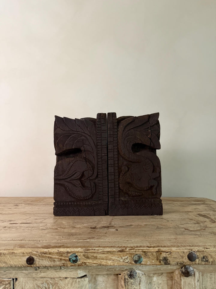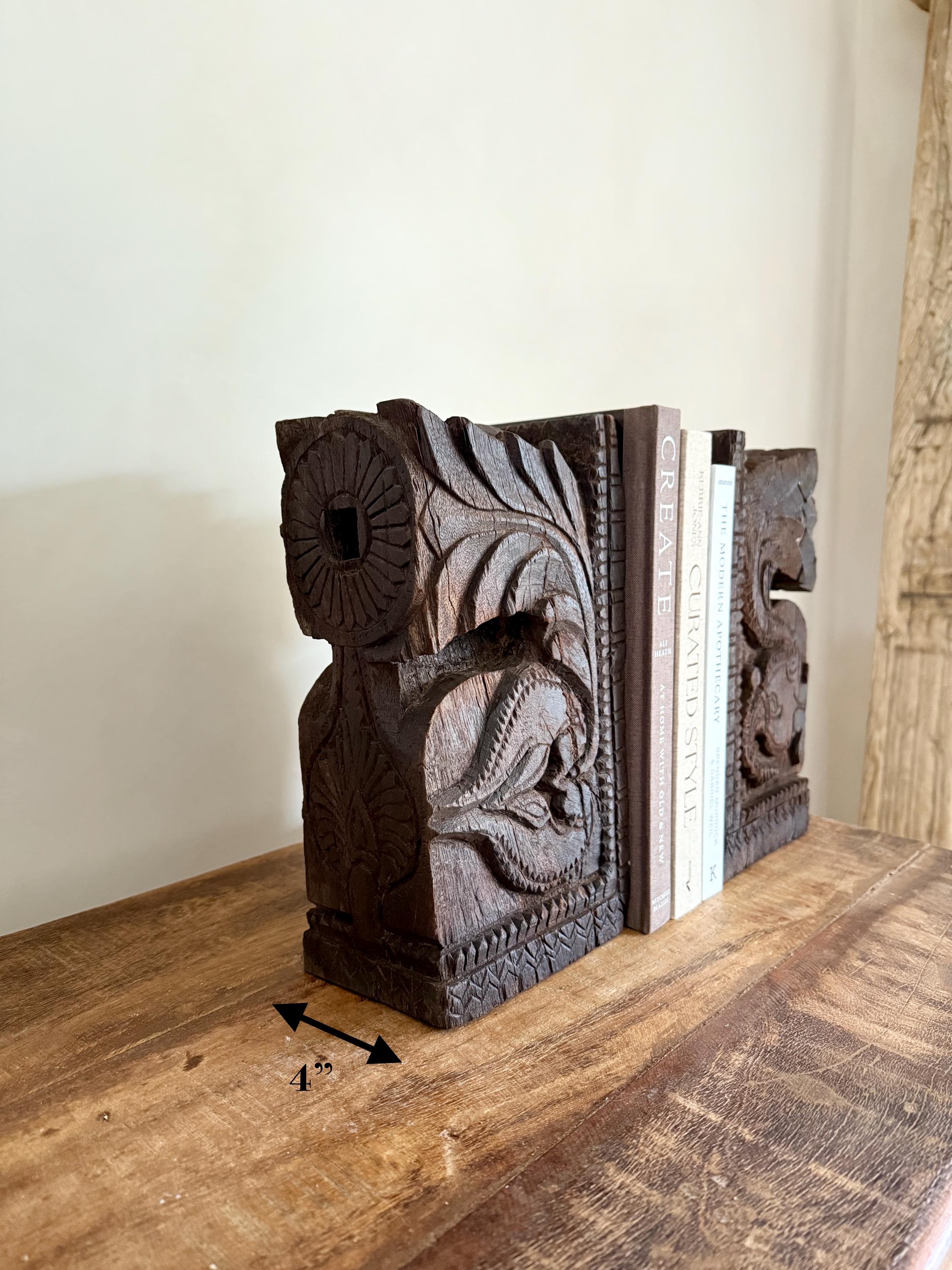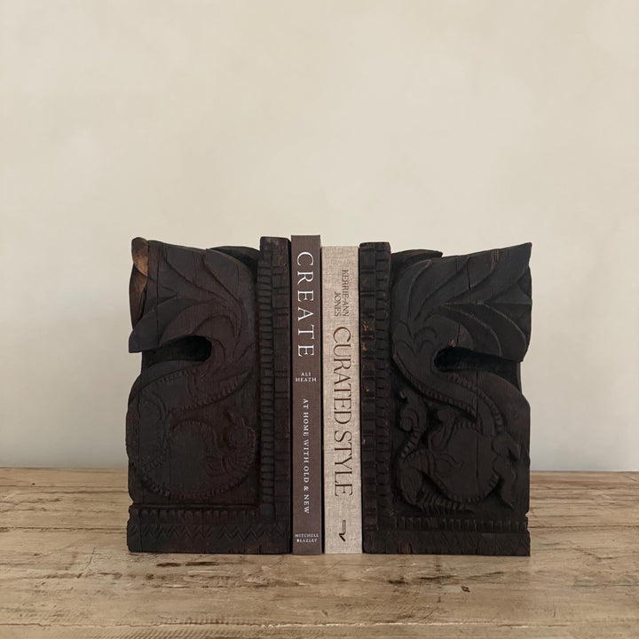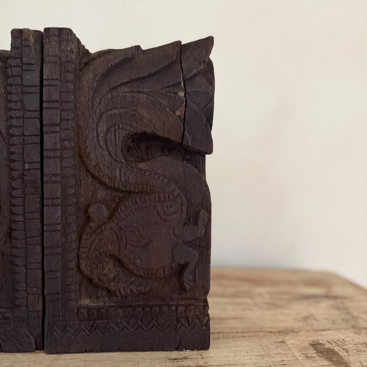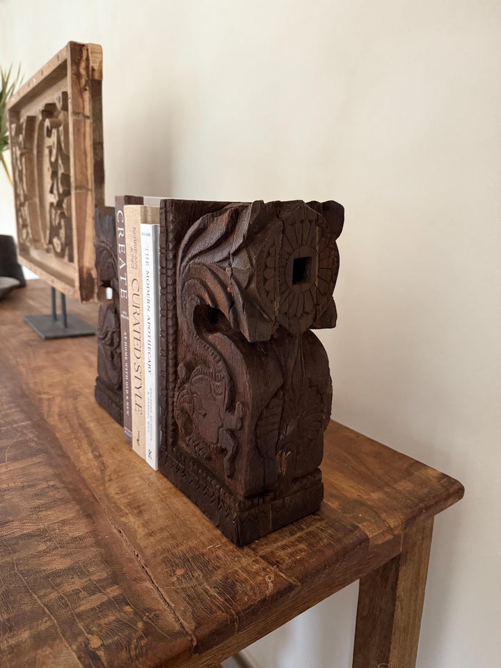 Add a touch of history and craftsmanship to your home with these one-of-a-kind Vintage Carved Bookends, repurposed from old Indian temple corbels. Originally used to support rails, balconies, and other architectural structures, these corbels have been thoughtfully transformed into functional and stunning bookends. Each piece carries intricate carvings that showcase the rich artistic traditions of India, making them a unique addition to any bookshelf or display.
