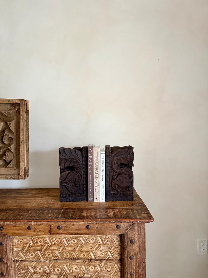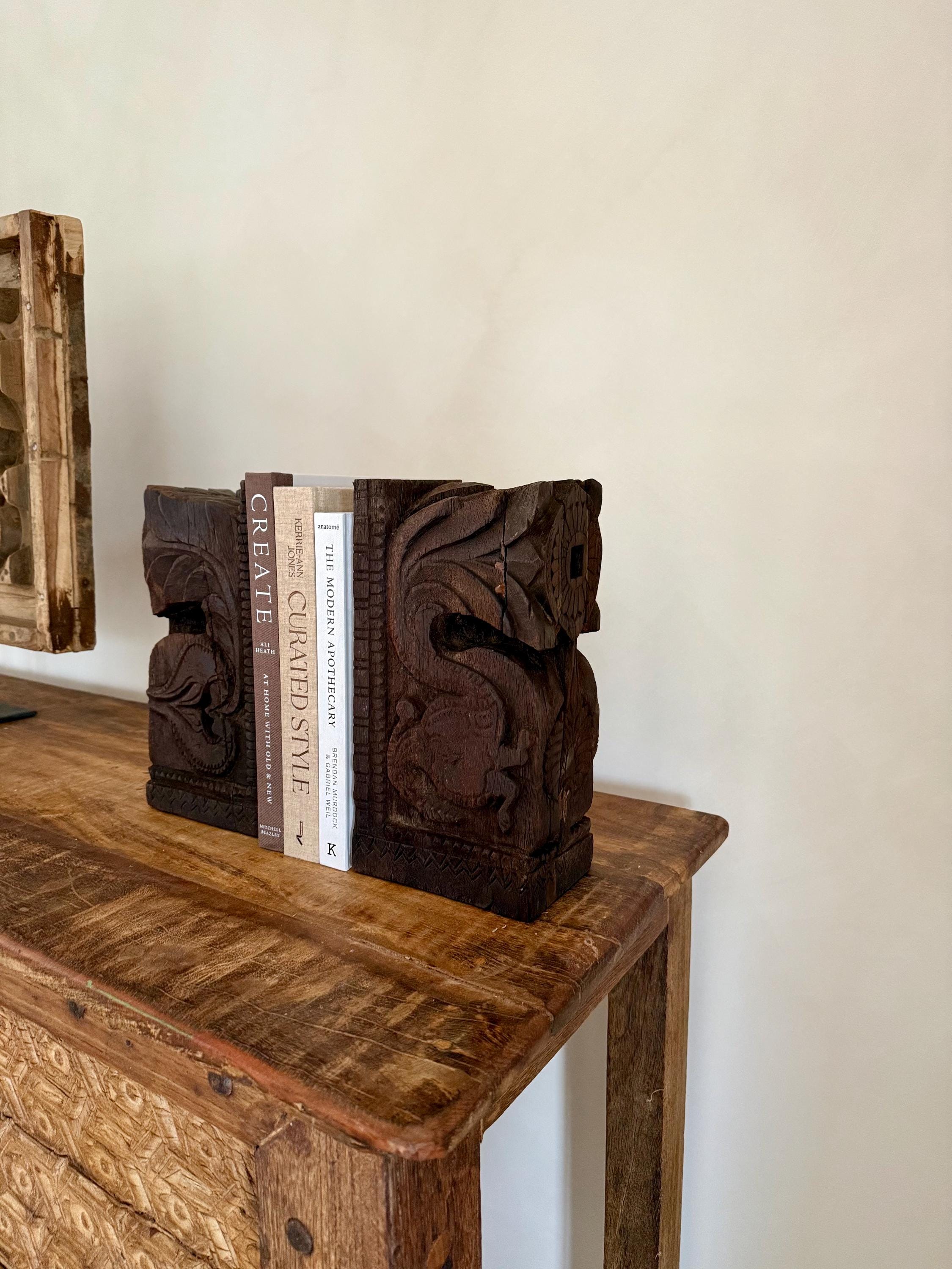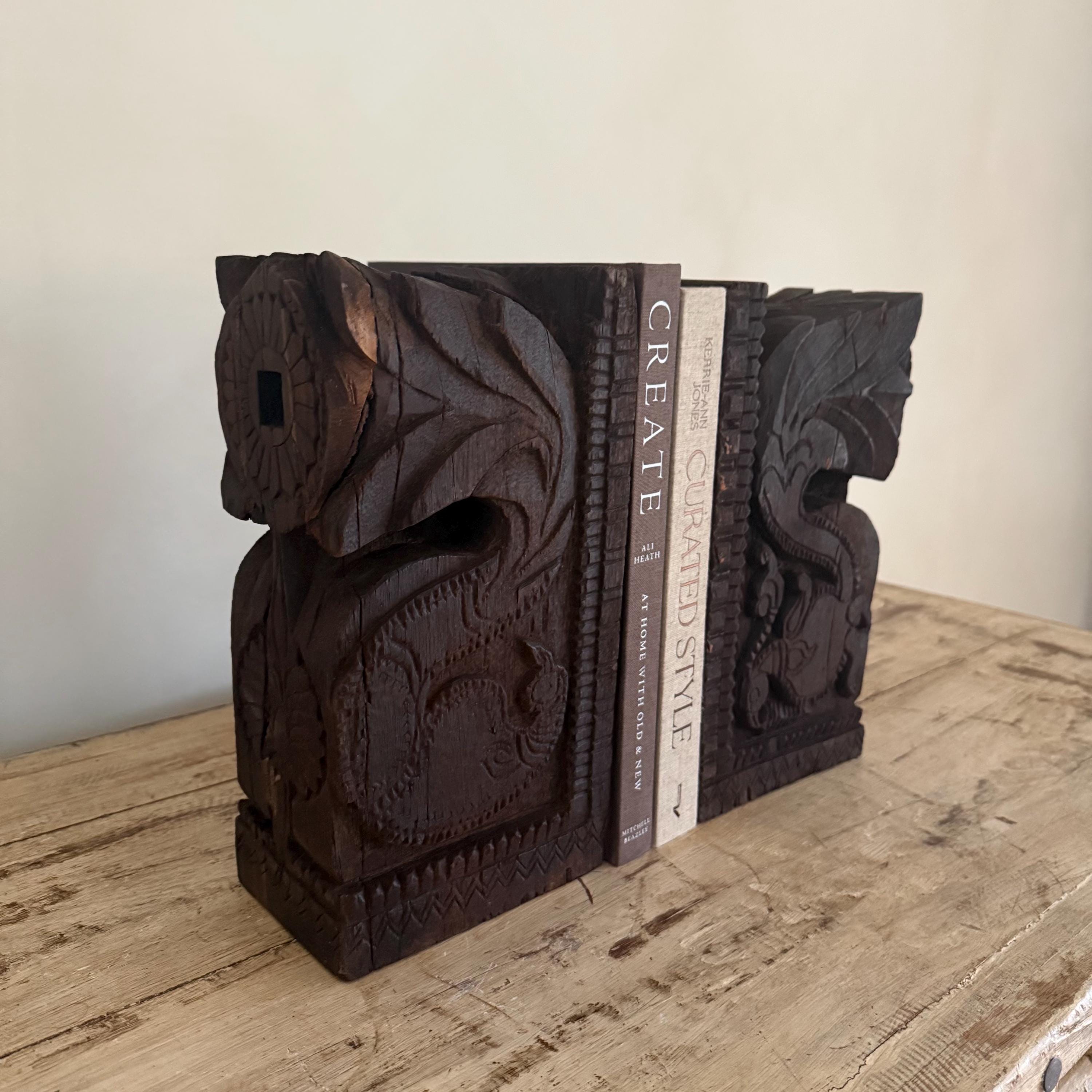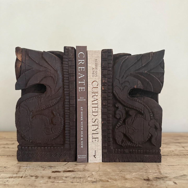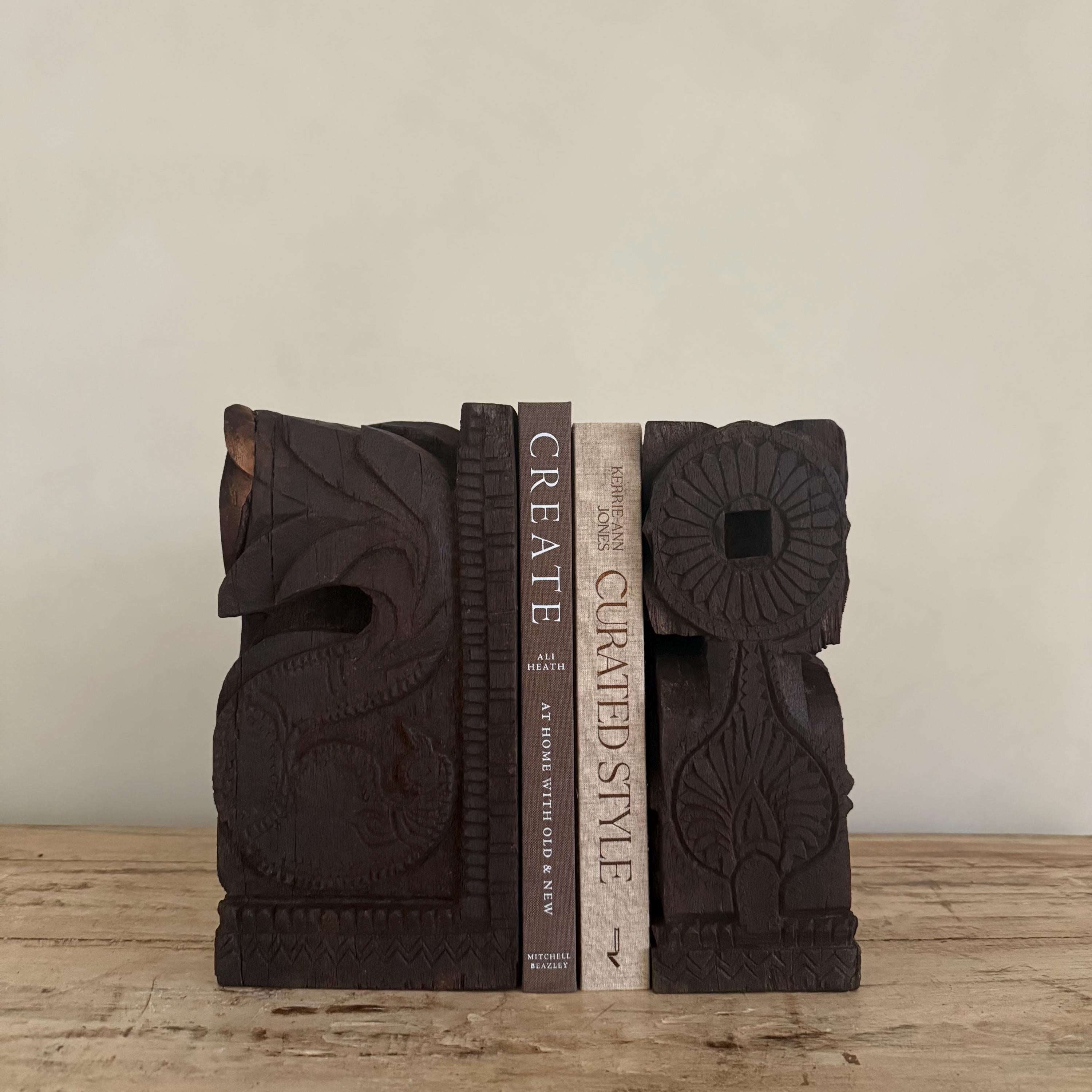 Add a touch of history and craftsmanship to your home with these one-of-a-kind Vintage Carved Bookends, repurposed from old Indian temple corbels. Originally used to support rails, balconies, and other architectural structures, these corbels have been thoughtfully transformed into functional and stunning bookends. Each piece carries intricate carvings that showcase the rich artistic traditions of India, making them a unique addition to any bookshelf or display.